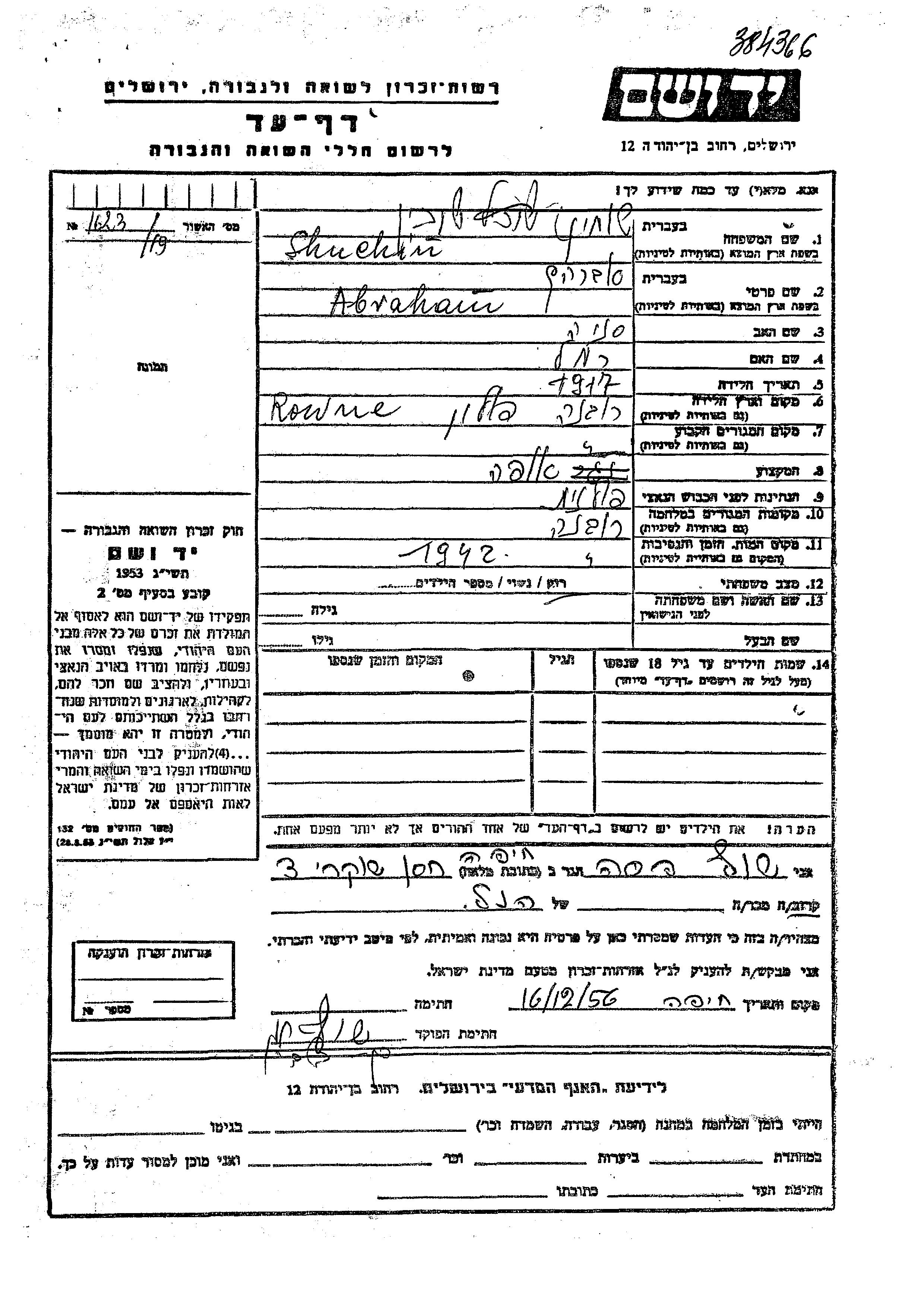 Абраам Шухин, место рождения: Ровно, Польша. Отец: Сеня, mать:Рахель. Пекарь. Холост / не замужем. Место жительства до войны: Ровно, Польша. Место во время войны: Ровно, Польша.