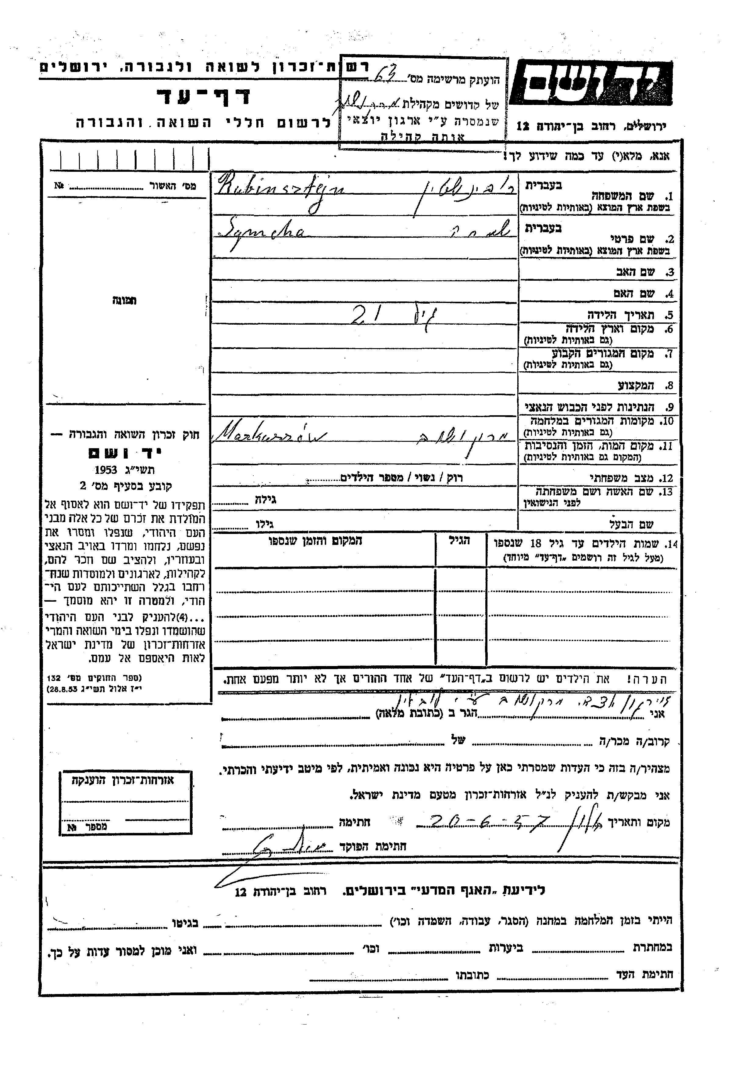 Рубинштейн Симха место не указано, Лист свидетельских показаний