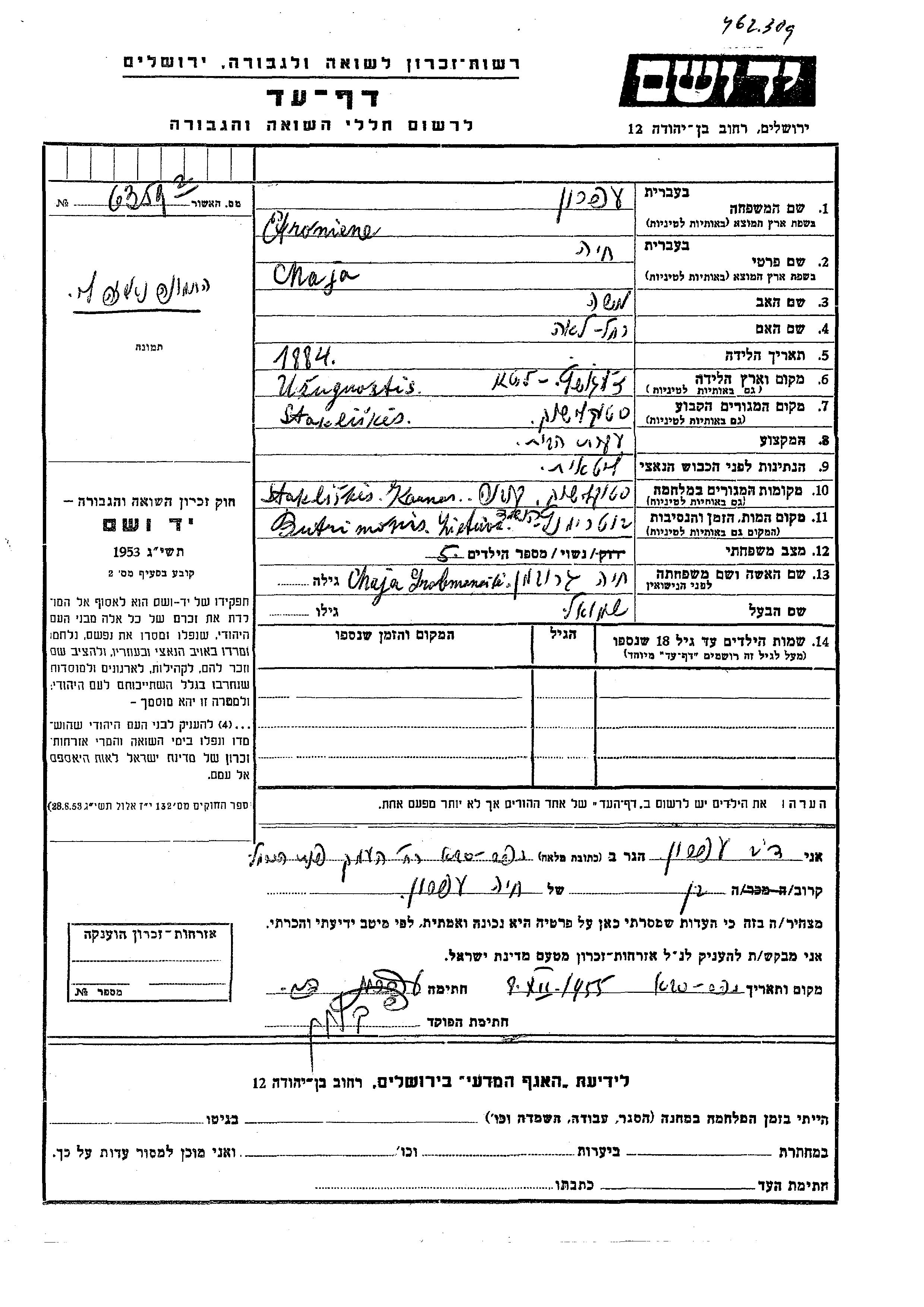 Яд Вашем - Листы свидетельских показаний Мемориального фонда