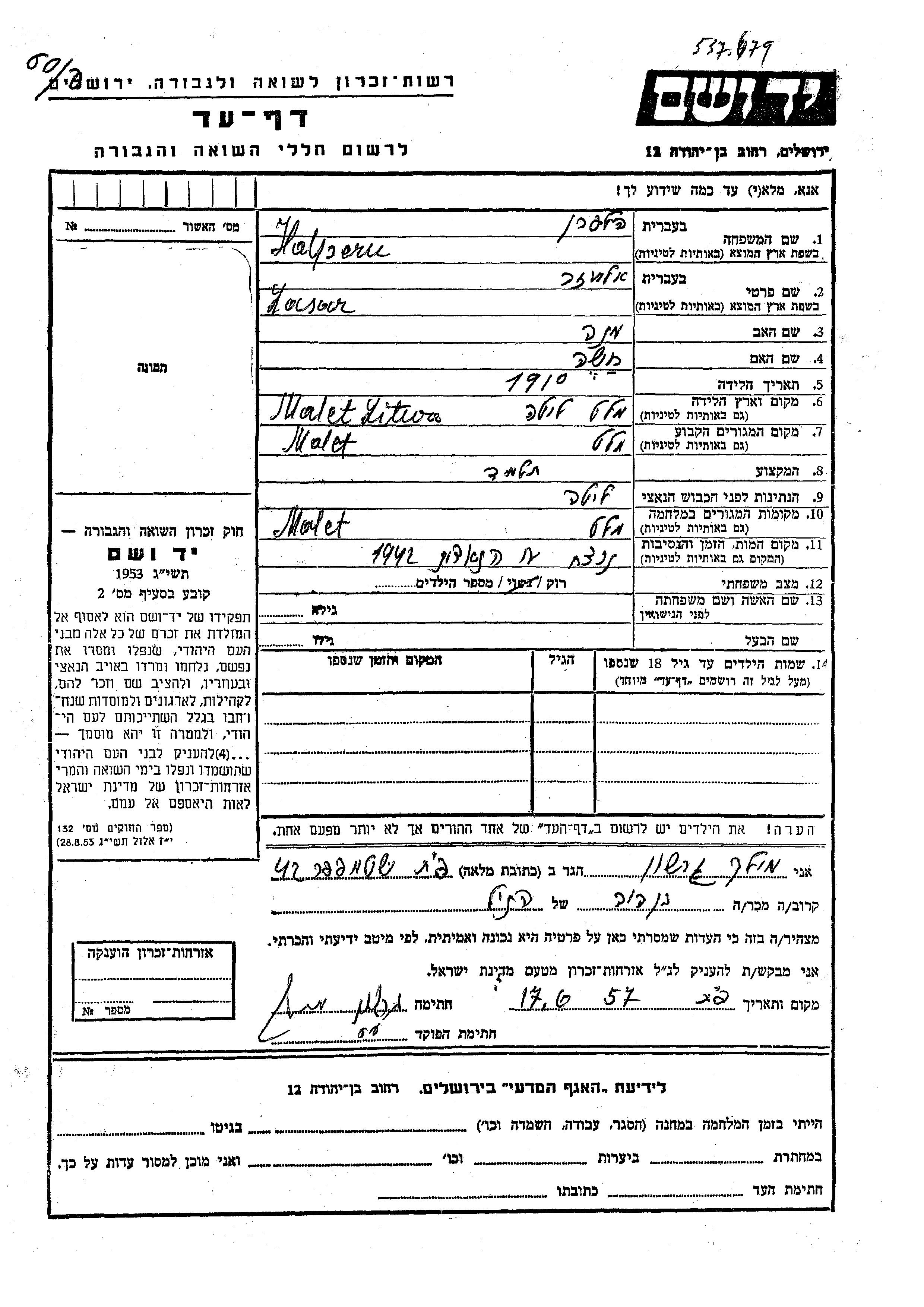Хальперн Лазарь 1910 Малетай, Литва Лист свидетельских показаний