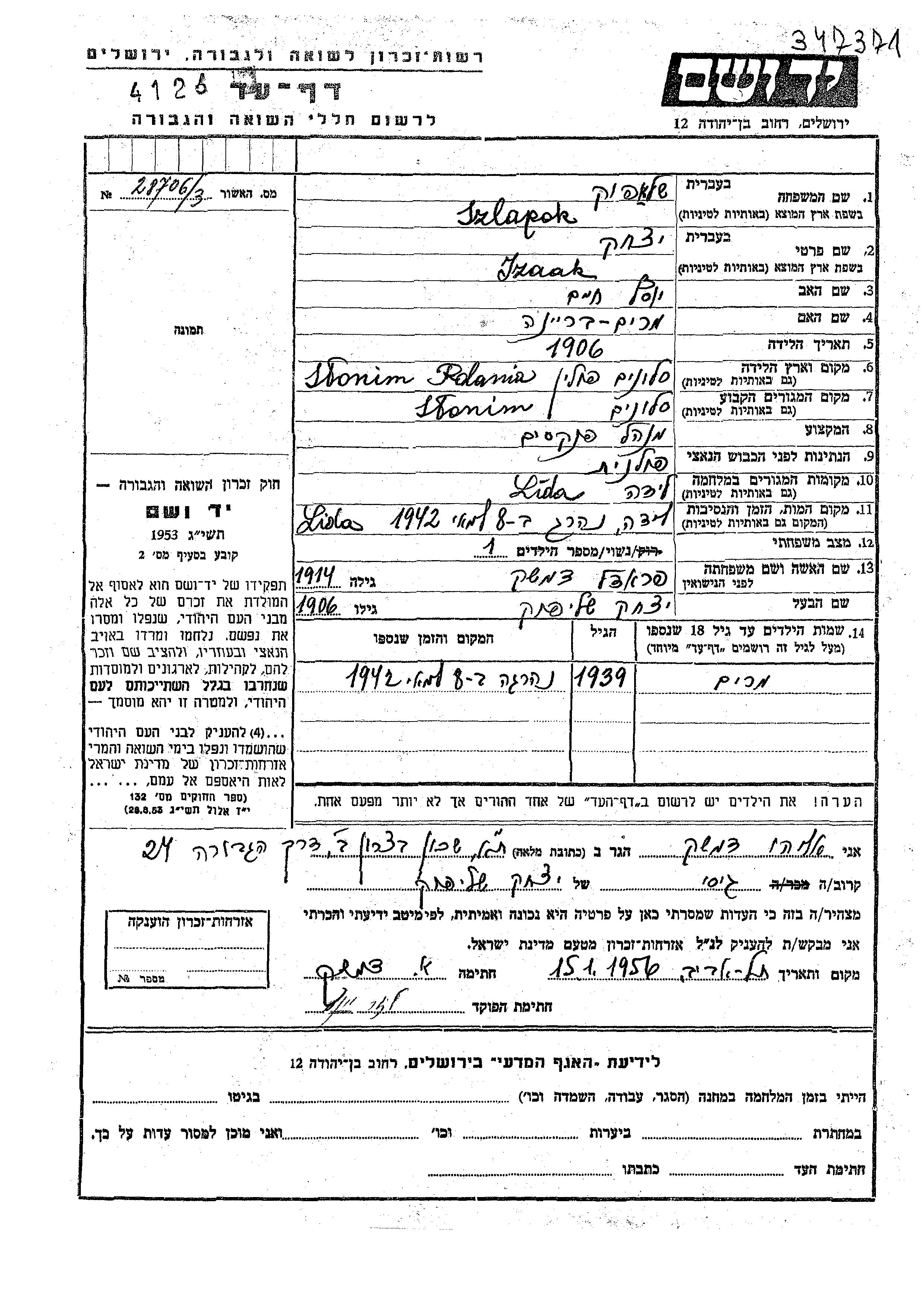 Изаак Шляпок, место рождения: Слоним, Польша. Отец: Иосеф Хаим, mать:Мирьям Брейна. Бухгалтер / счетовод. Женат / замужем. Место жительства до войны: Слоним, Польша. Место во время войны: Лида, Польша.