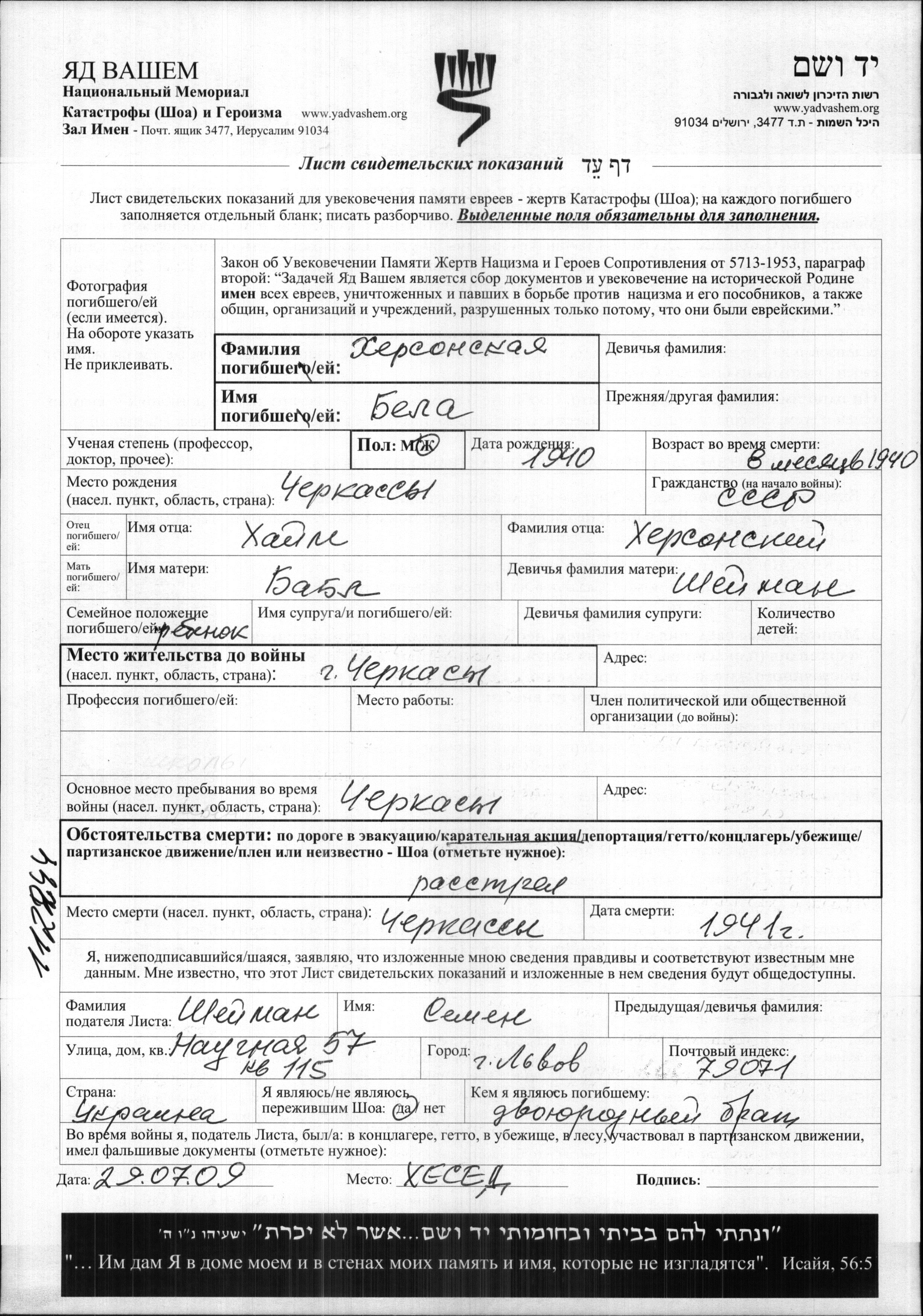 Бела Херсонская, место рождения: Черкассы, Украина (СССР). Отец: Хаим, mать:Бабл, девичья фамилия Шейман. Младенец. Место жительства до войны: Черкассы, Украина (СССР). Место во время войны: Черкассы, Украина (СССР).