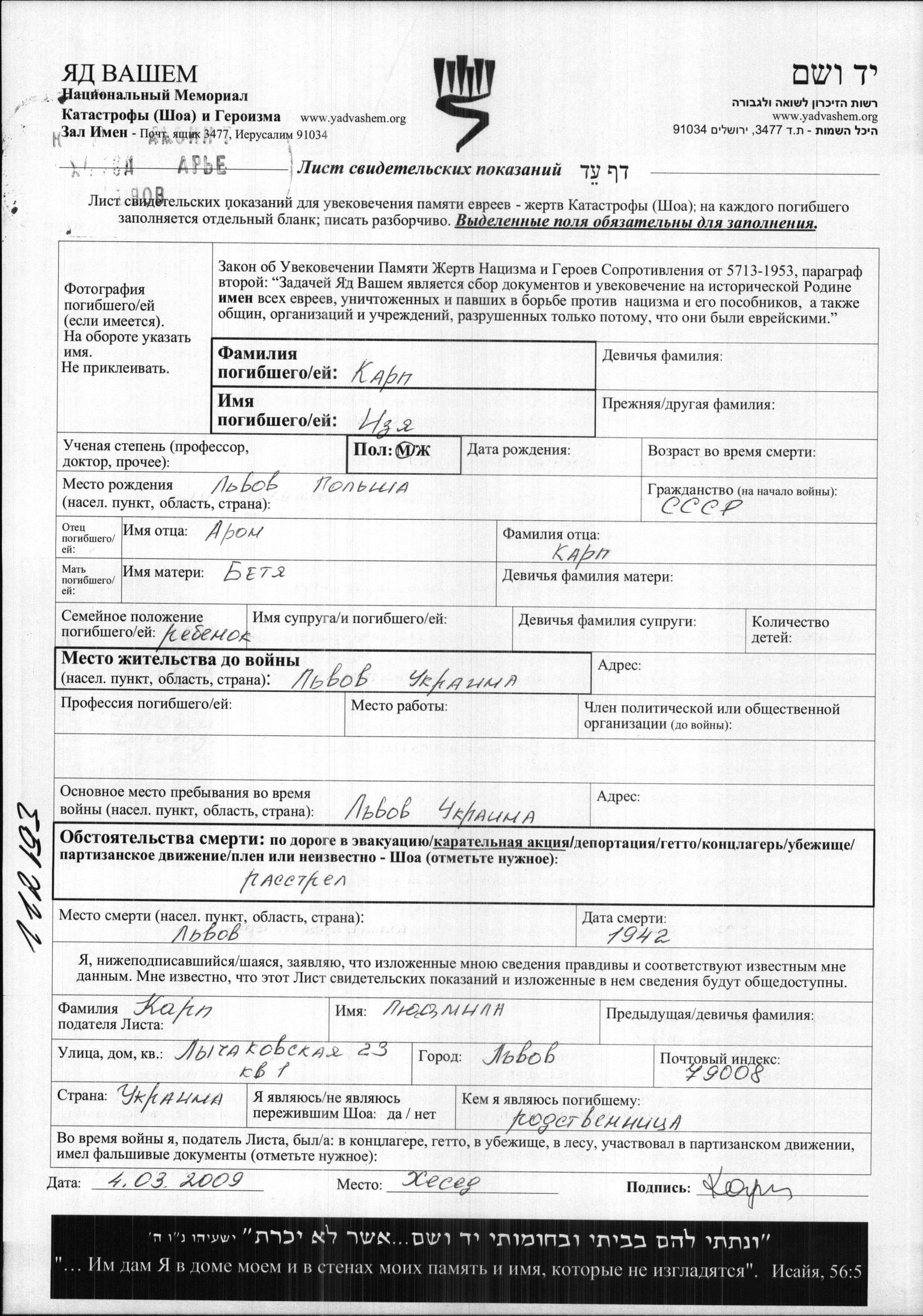 Яд Вашем - Листы свидетельских показаний Мемориального фонда