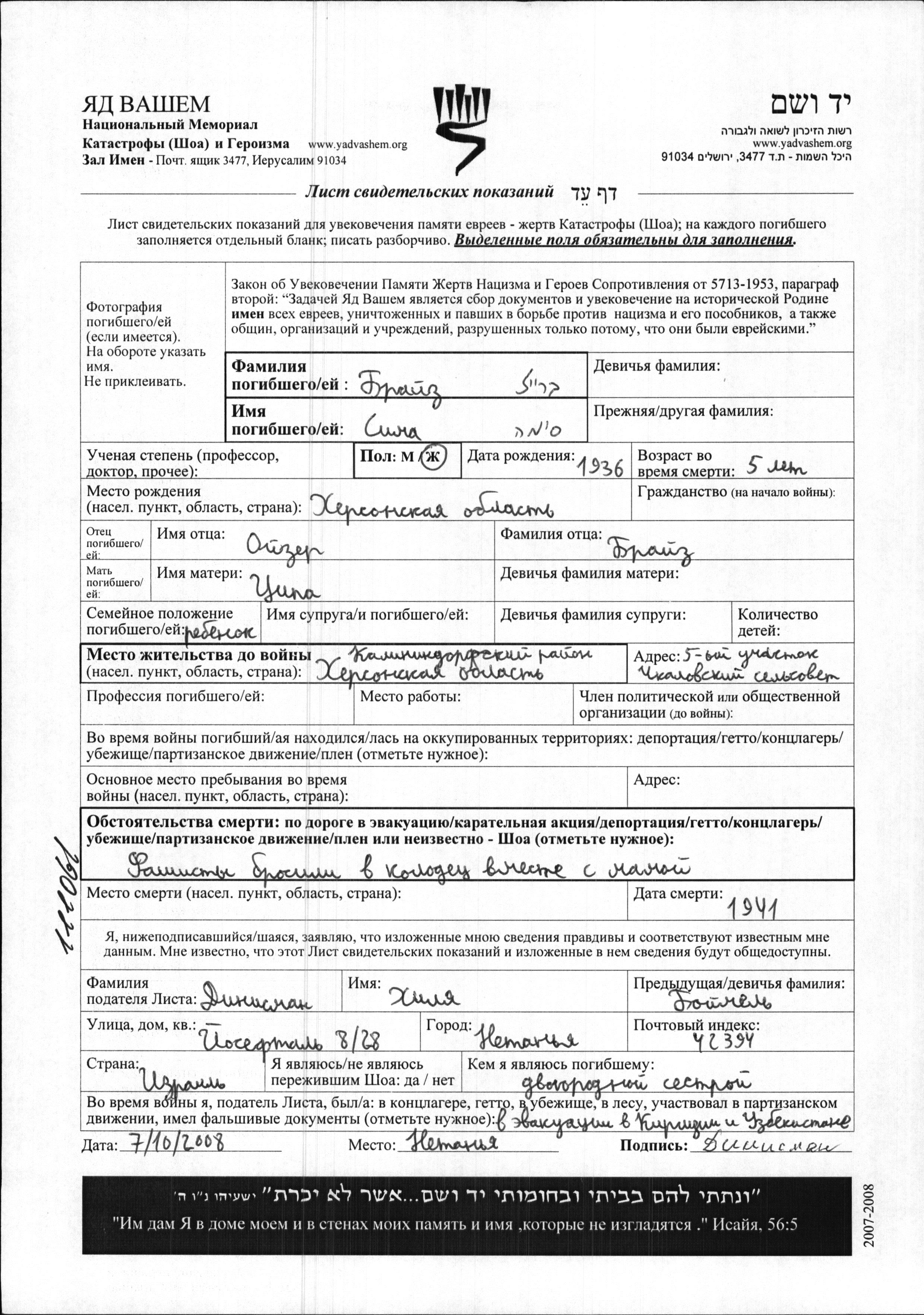 Яд Вашем - Листы свидетельских показаний Мемориального фонда