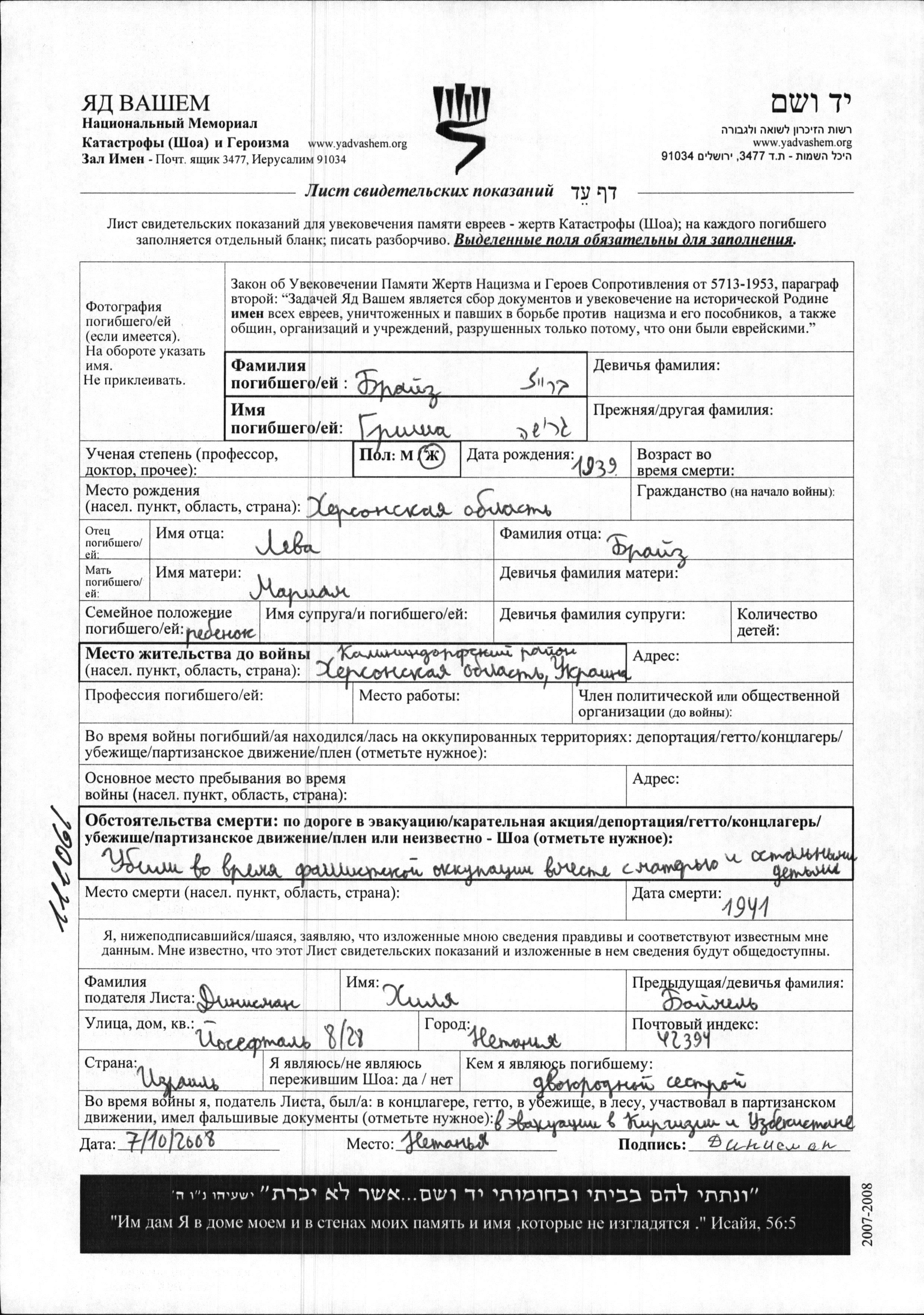 Яд Вашем - Листы свидетельских показаний Мемориального фонда