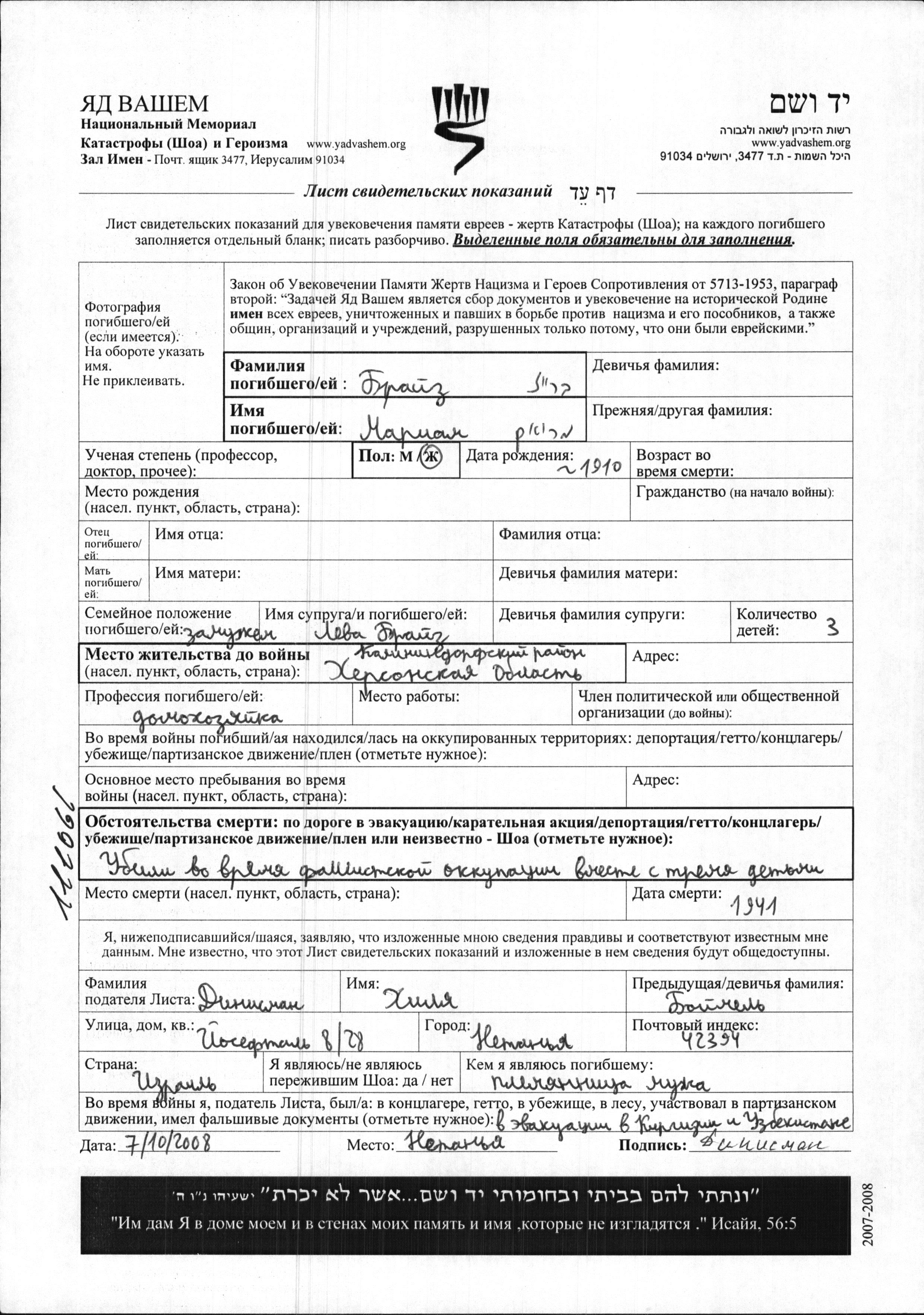 Поиск подателя Листа свидетельских показаний. Поиск по любому имени, включая уменьшительное или прозвище