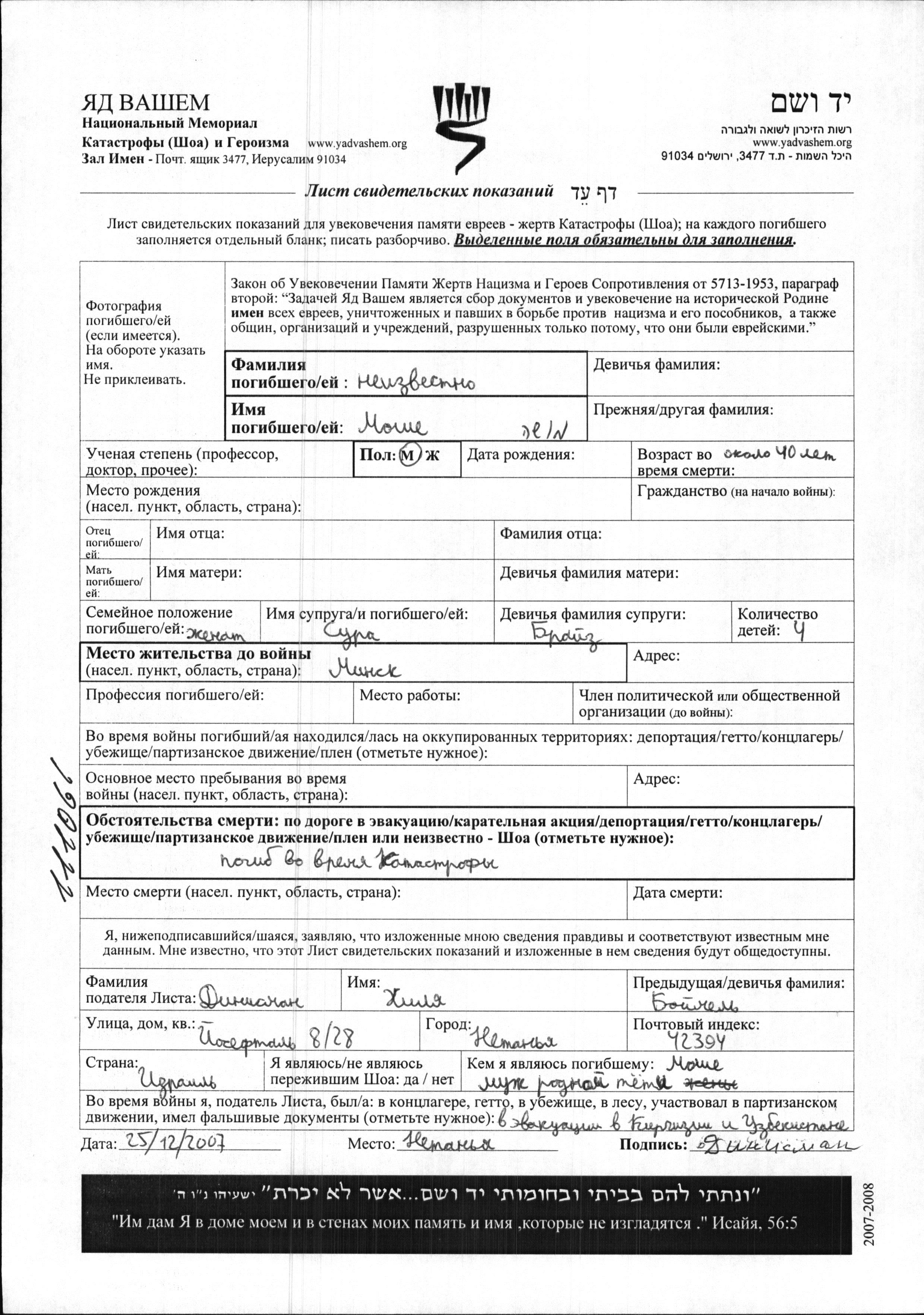 Яд Вашем - Листы свидетельских показаний Мемориального фонда