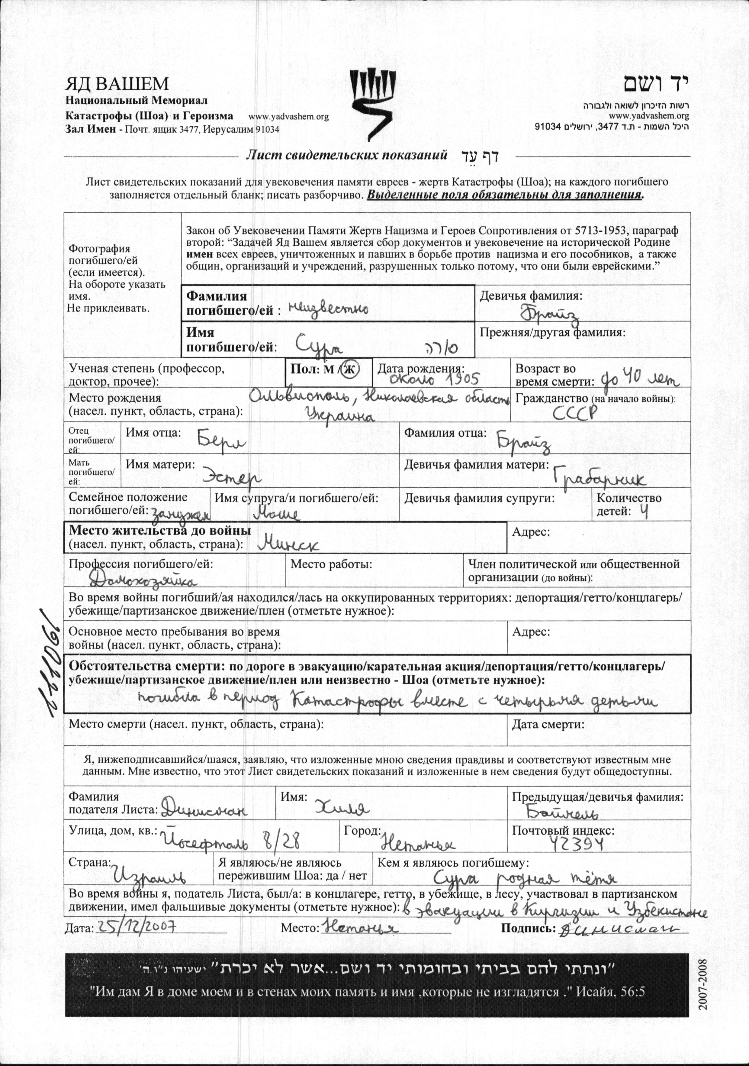 Яд Вашем - Листы свидетельских показаний Мемориального фонда