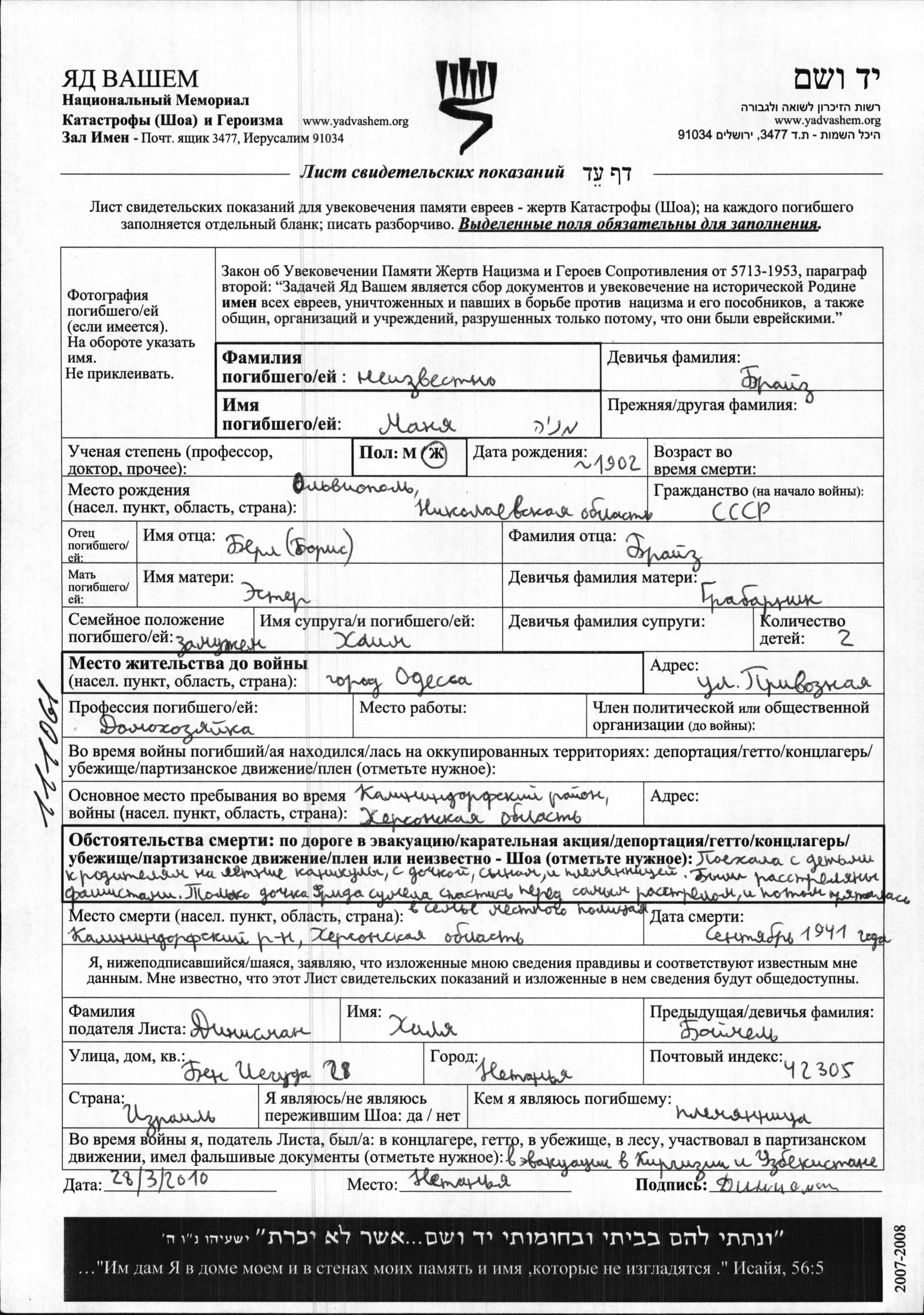 Маня Фамилия неизвестна, девичья фамилия Брайз, место рождения: Ольвиополь, Украина (СССР). Отец: Берл Борис, mать:Эстер, девичья фамилия Грабарник. Домохозяйка. Женат / замужем. Место жительства до войны: Одесса, Украина (СССР). Место во время войны: Калининдорфский Р-н, Украина (СССР).