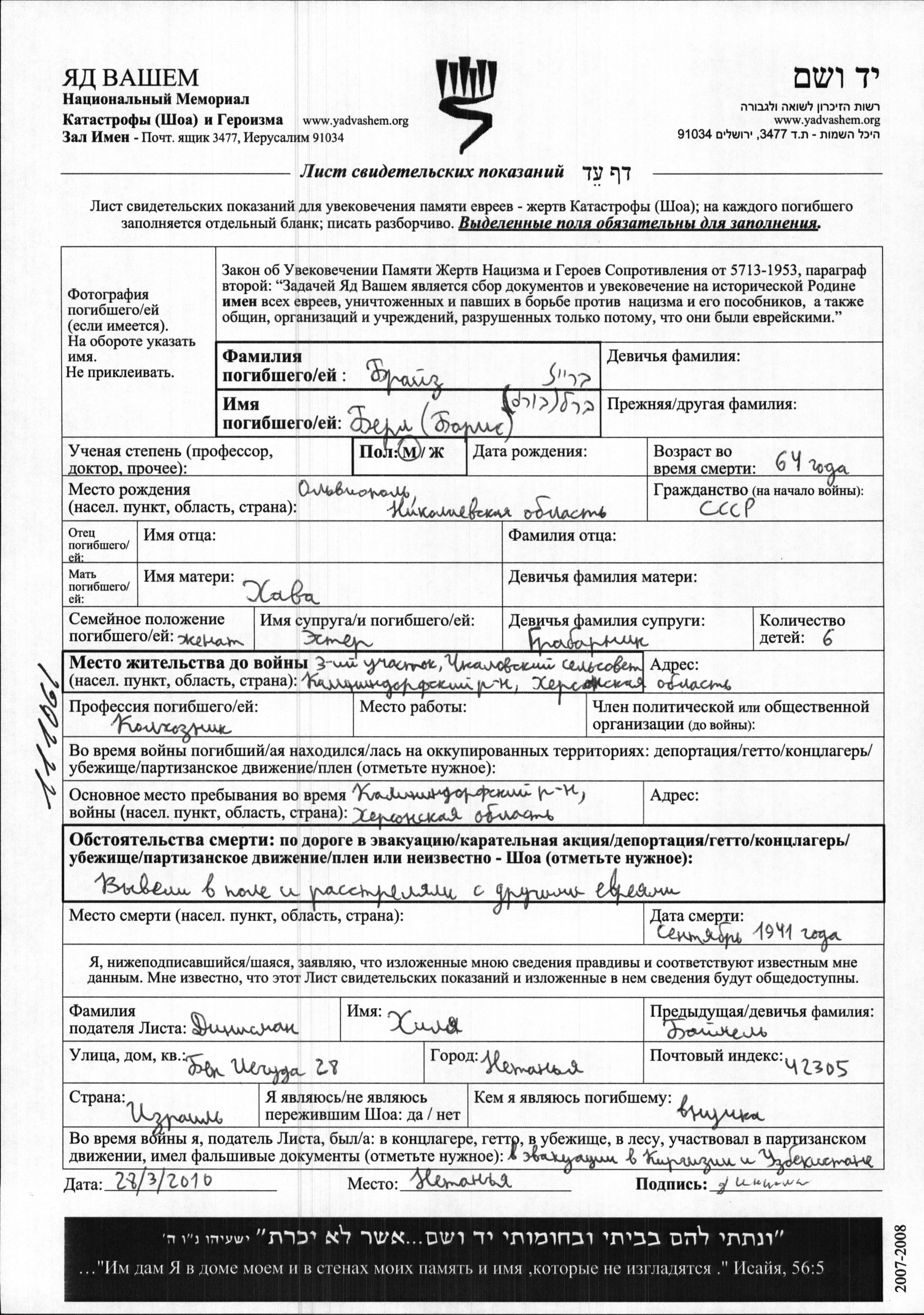 Берл Борис Брайз, место рождения: Ольвиополь, Украина (СССР).Mать:Хава. Женат / замужем. Место жительства до войны: Николаевская Обл., Украина (СССР). Место во время войны: Николаевская Обл., Украина (СССР).
