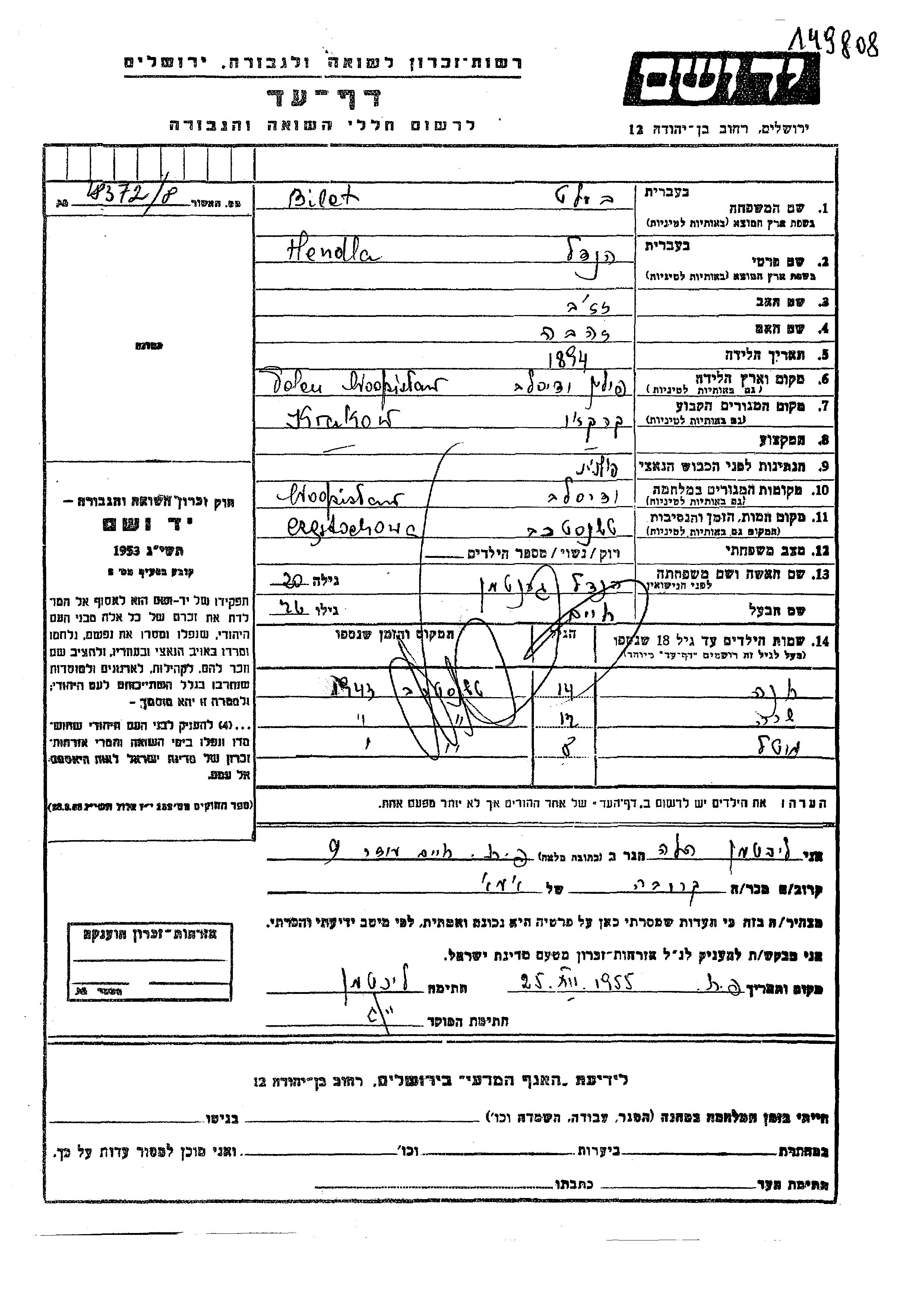 Хендла Билет, место рождения: Водислав, Польша. Отец: Зеев, mать:Захава. Женат / замужем. Место жительства до войны: Краков, Польша. Место во время войны: Водислав, Польша.