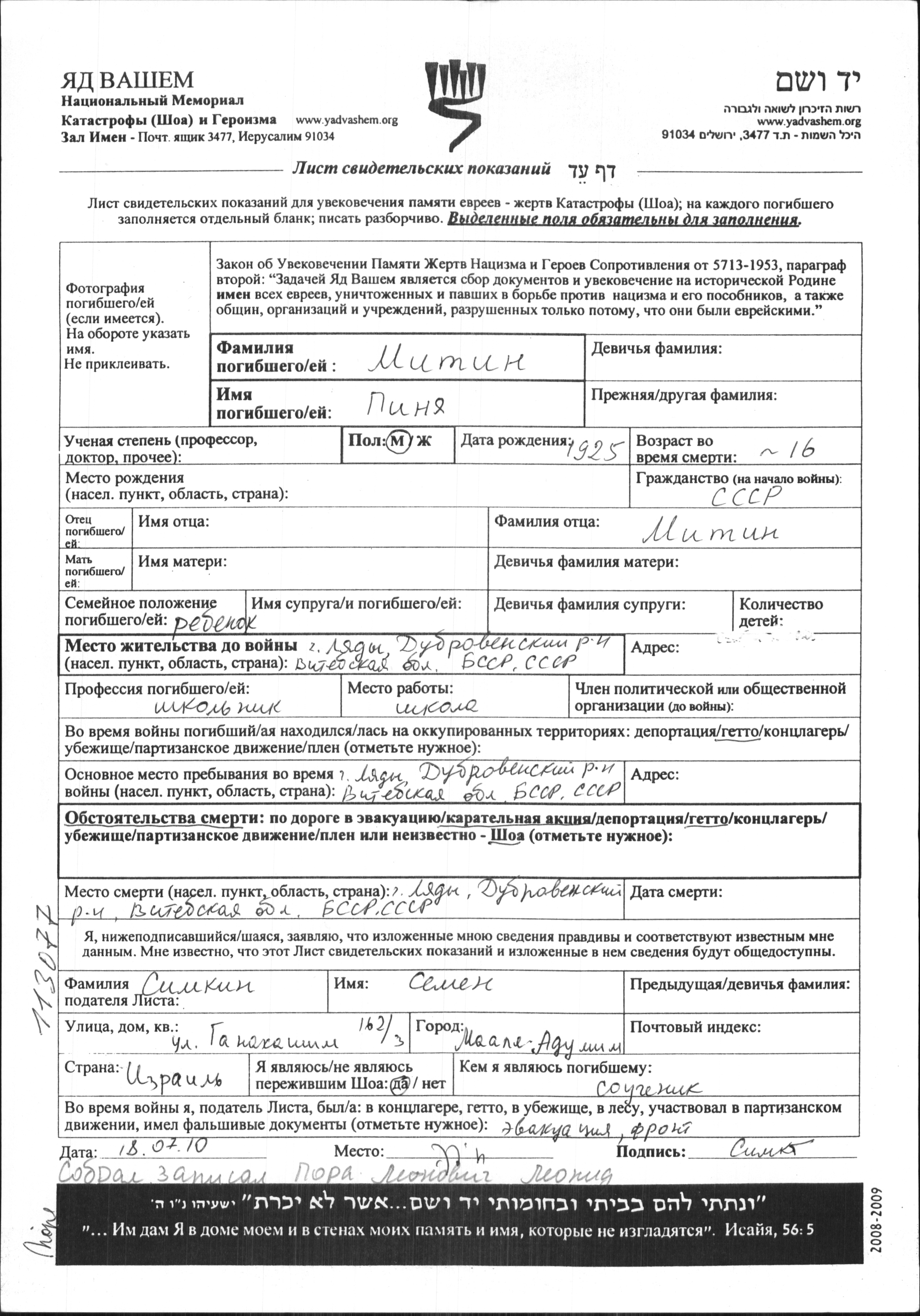 Митин Пиня 1925 Ляды, Белоруссия (СССР) Лист свидетельских показаний