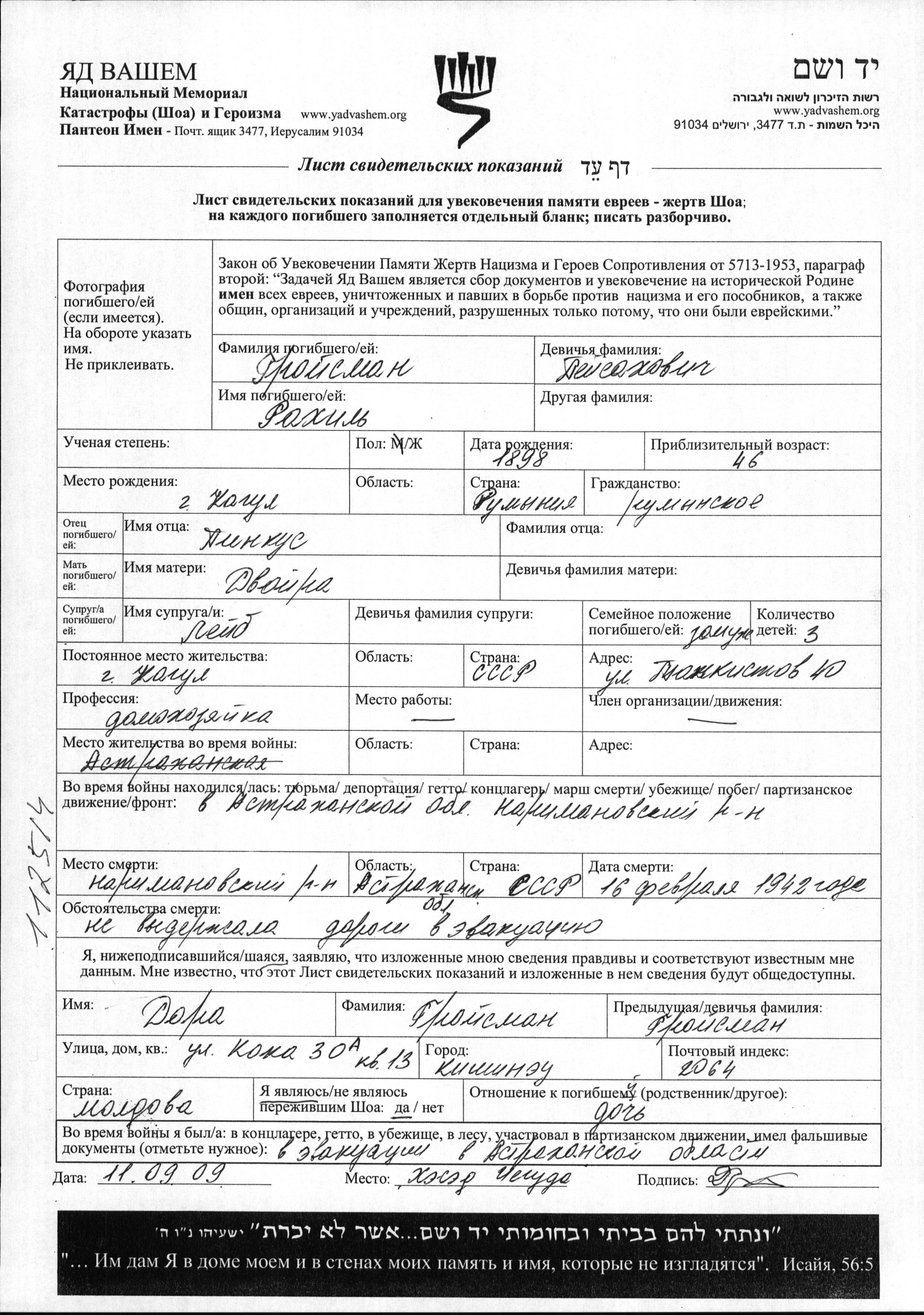 Гройсман Рахиль 1898 Кагул, Румыния Лист свидетельских показаний
