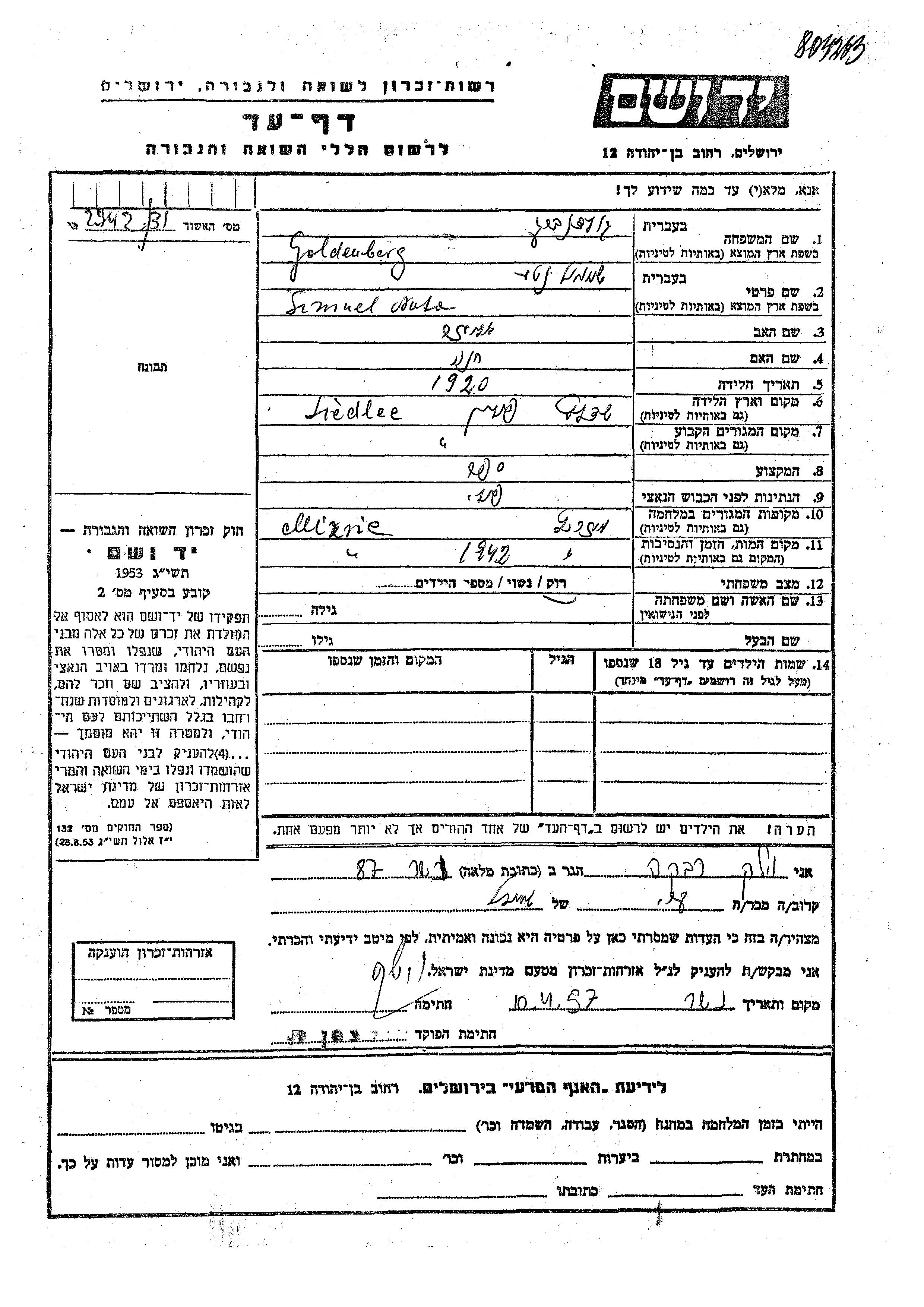 Шмуэль Нута Гольденберг, место рождения: Седльце, Польша. Отец: Элиэзер, mать:Хана. Парикмахер. Холост / не замужем. Место жительства до войны: Седльце, Польша. Место во время войны: Мезерич, Польша.
