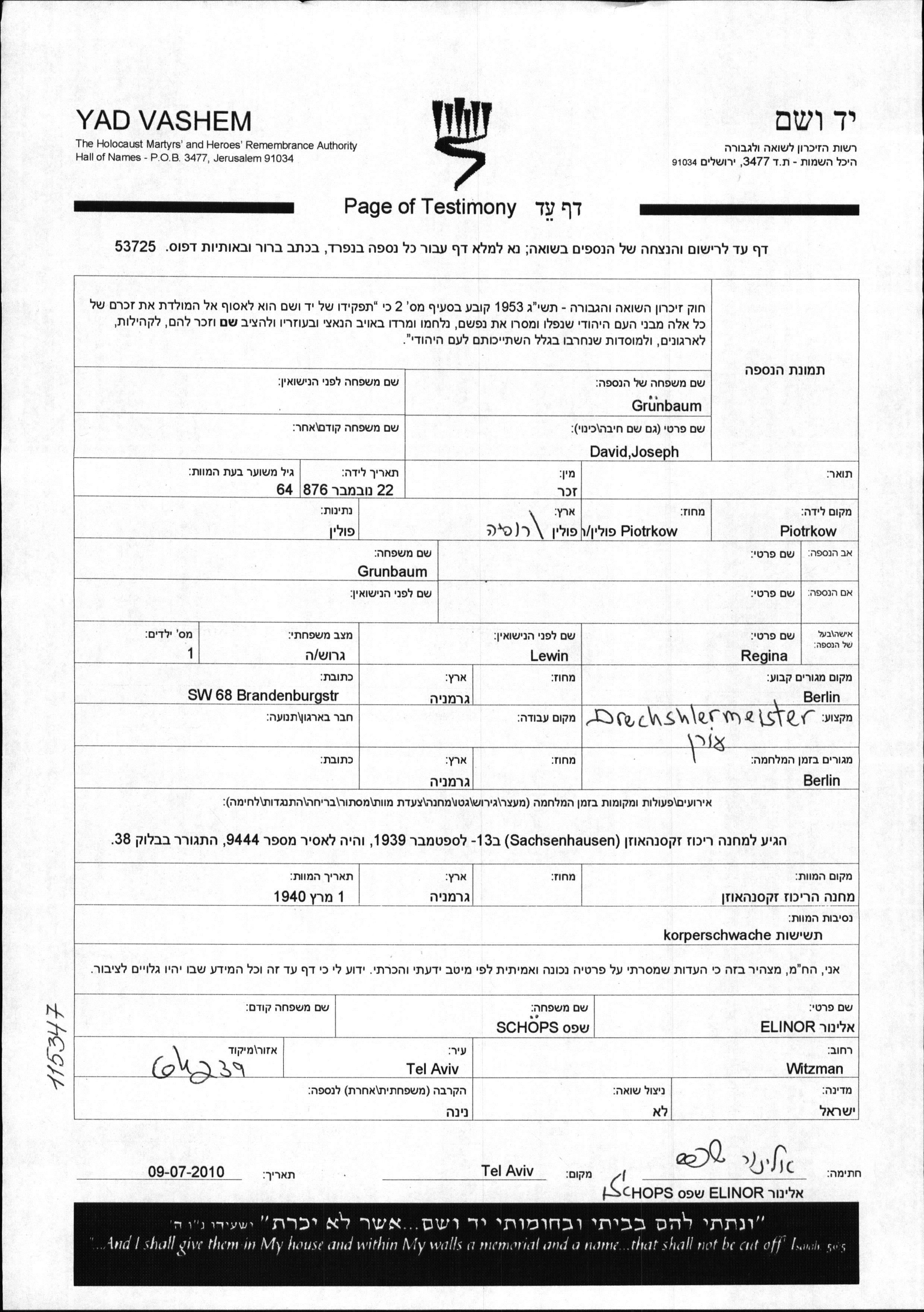 Йосеф Давид Грюнбаум, место рождения: Пётркув, Польша. Drechsler. Разведен / разведена. Место жительства до войны: Берлин, Германия. Место во время войны: Берлин, Германия.