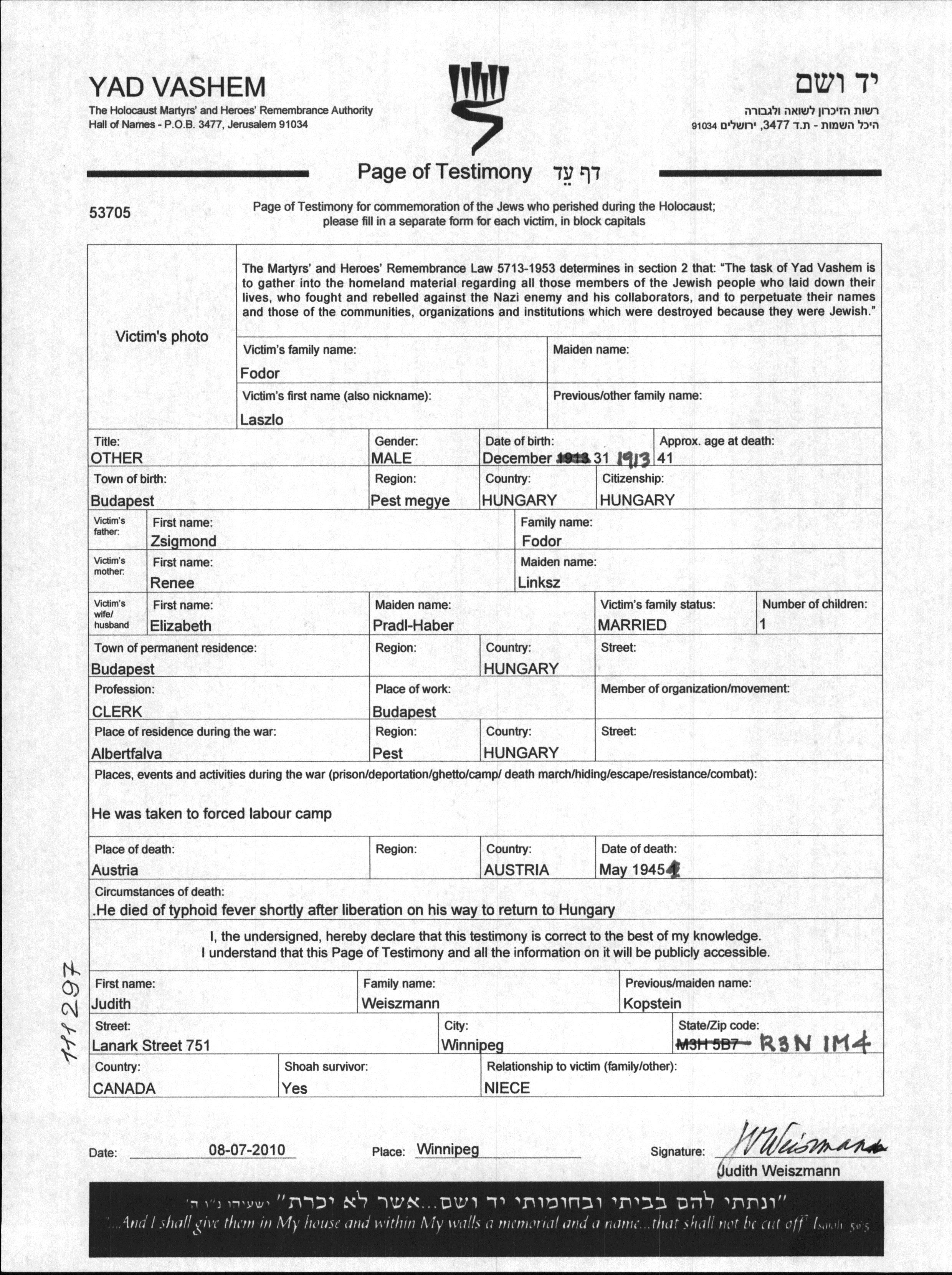Ласло Фодор, место рождения: Будапешт, Венгрия. Отец: Жигмунд, mать:Рене, девичья фамилия Линкс. Клерк. Женат / замужем. Место жительства до войны: Будапешт, Венгрия. Место во время войны: ЛАГЕРЬ.