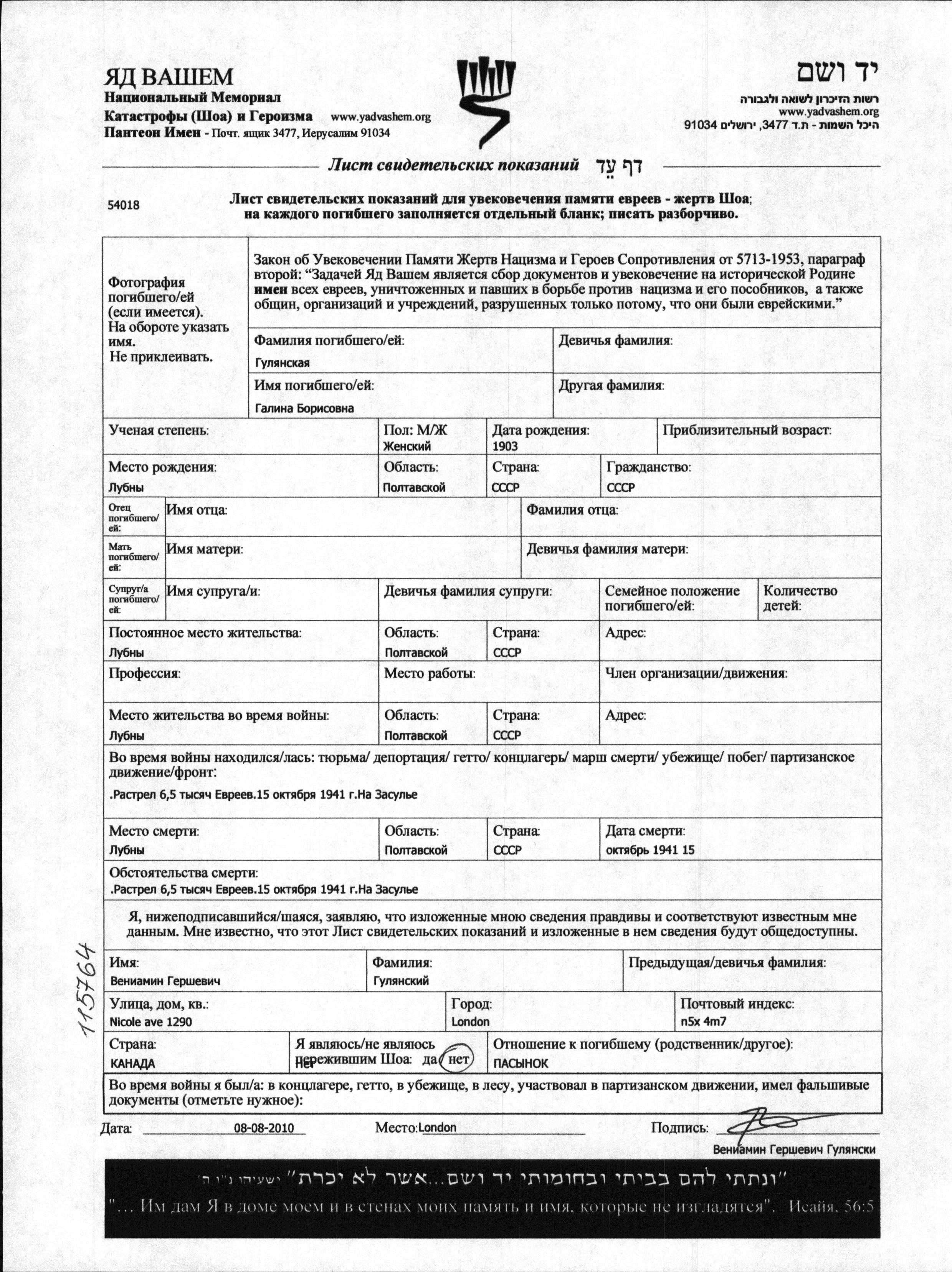 Галина Гулянская, место рождения: Лубны, Украина (СССР). Место жительства до войны: Лубны, Украина (СССР). Место во время войны: Лубны, Украина (СССР). Галина уничтоженa в период Шоа. место смерти: Засулье, Украина (СССР) в 15/10/1941.