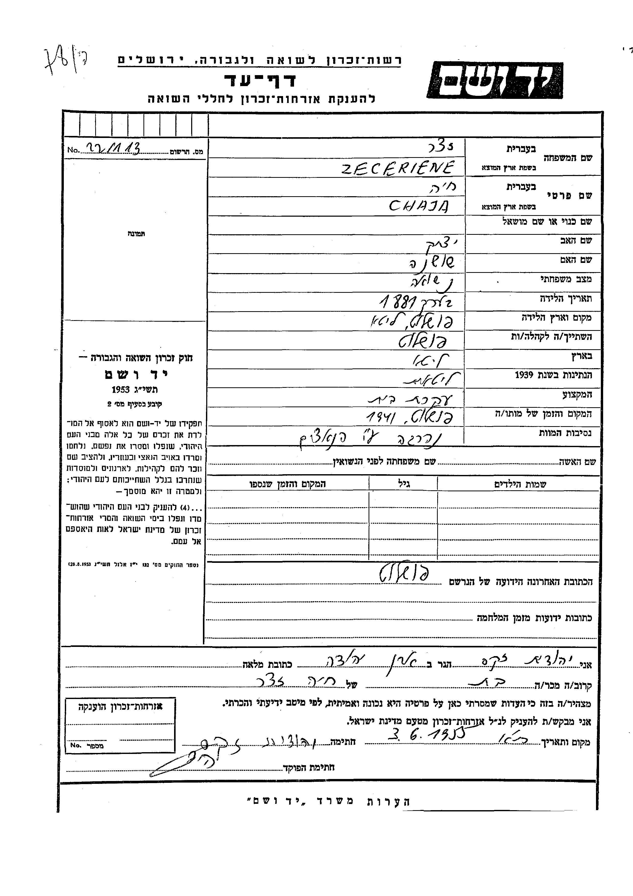 Хая Зецериене, место рождения: Пушалотас, Литва. Отец: Ицхак, mать:Шошана. Домохозяйка. Место жительства до войны: Пушалотас, Литва.
