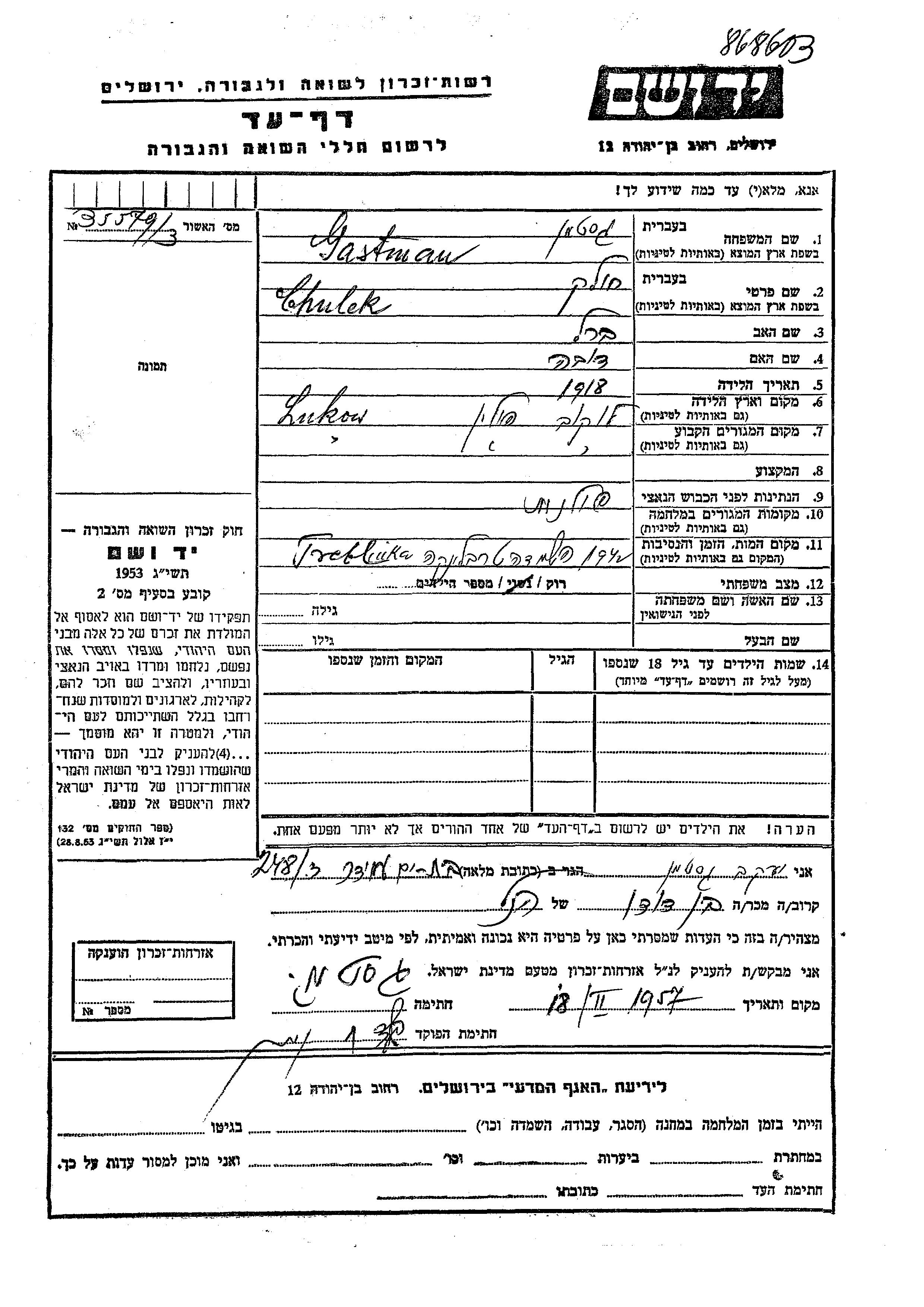 Гастман Иехиэль 1918 Лукув, Польша Лист свидетельских показаний