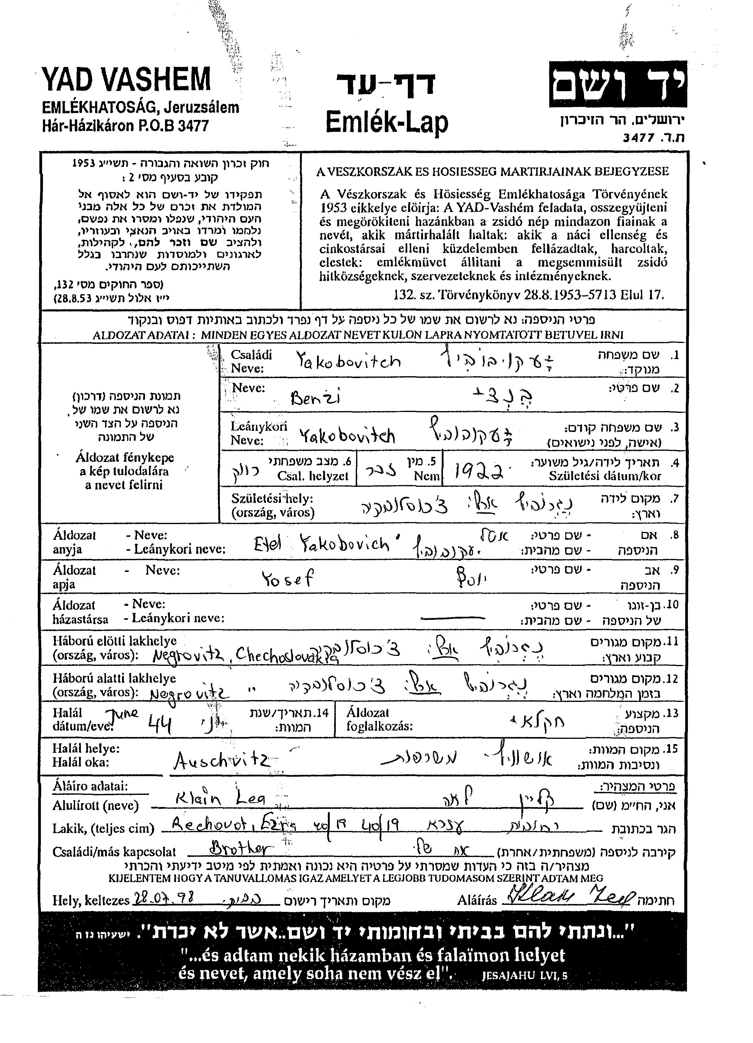 Якубовиц Бенци 1922 Негровец, Чехословакия Лист свидетельских показаний