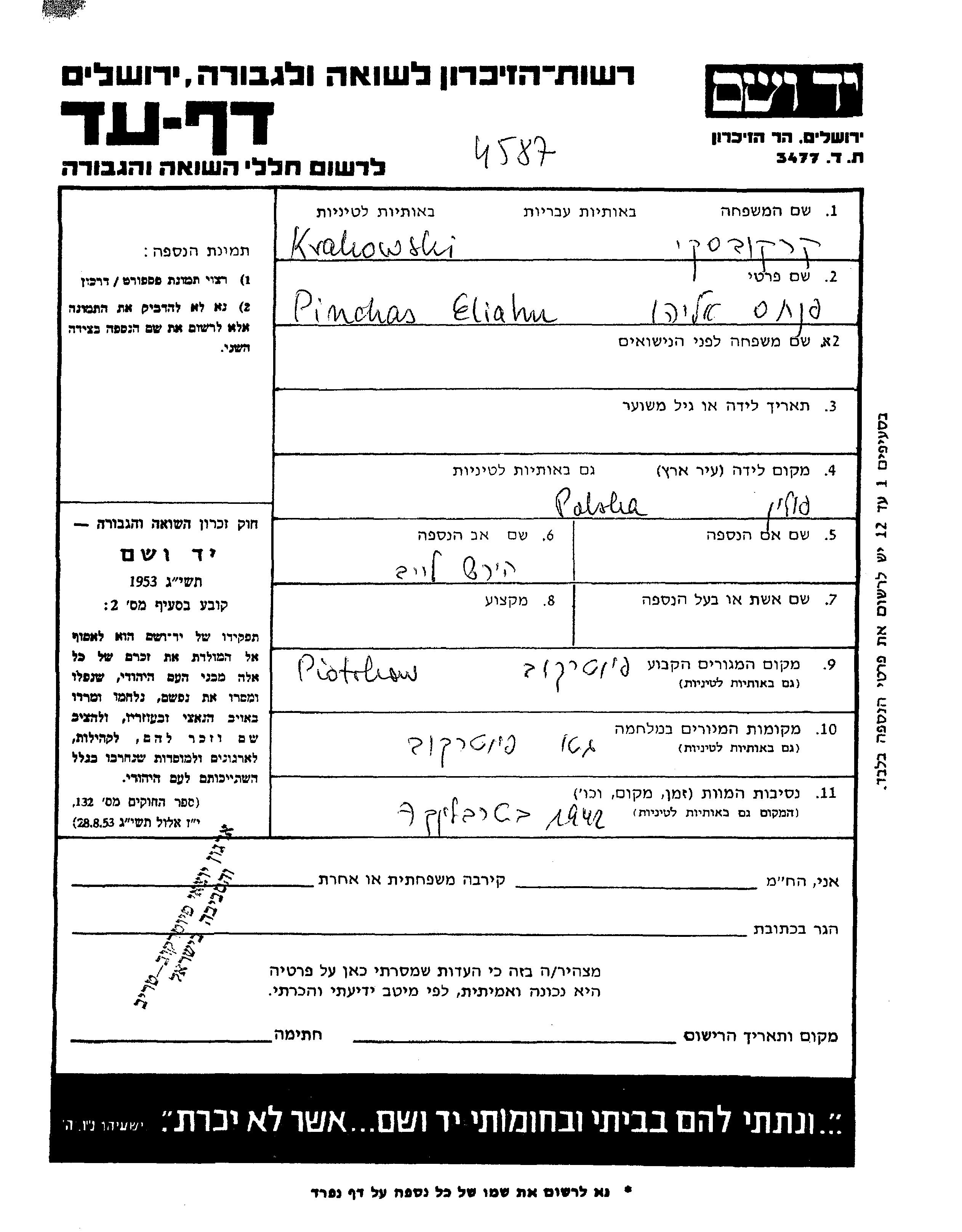 Краковски Пинхас Элиягу место не указано, Лист свидетельских показаний
