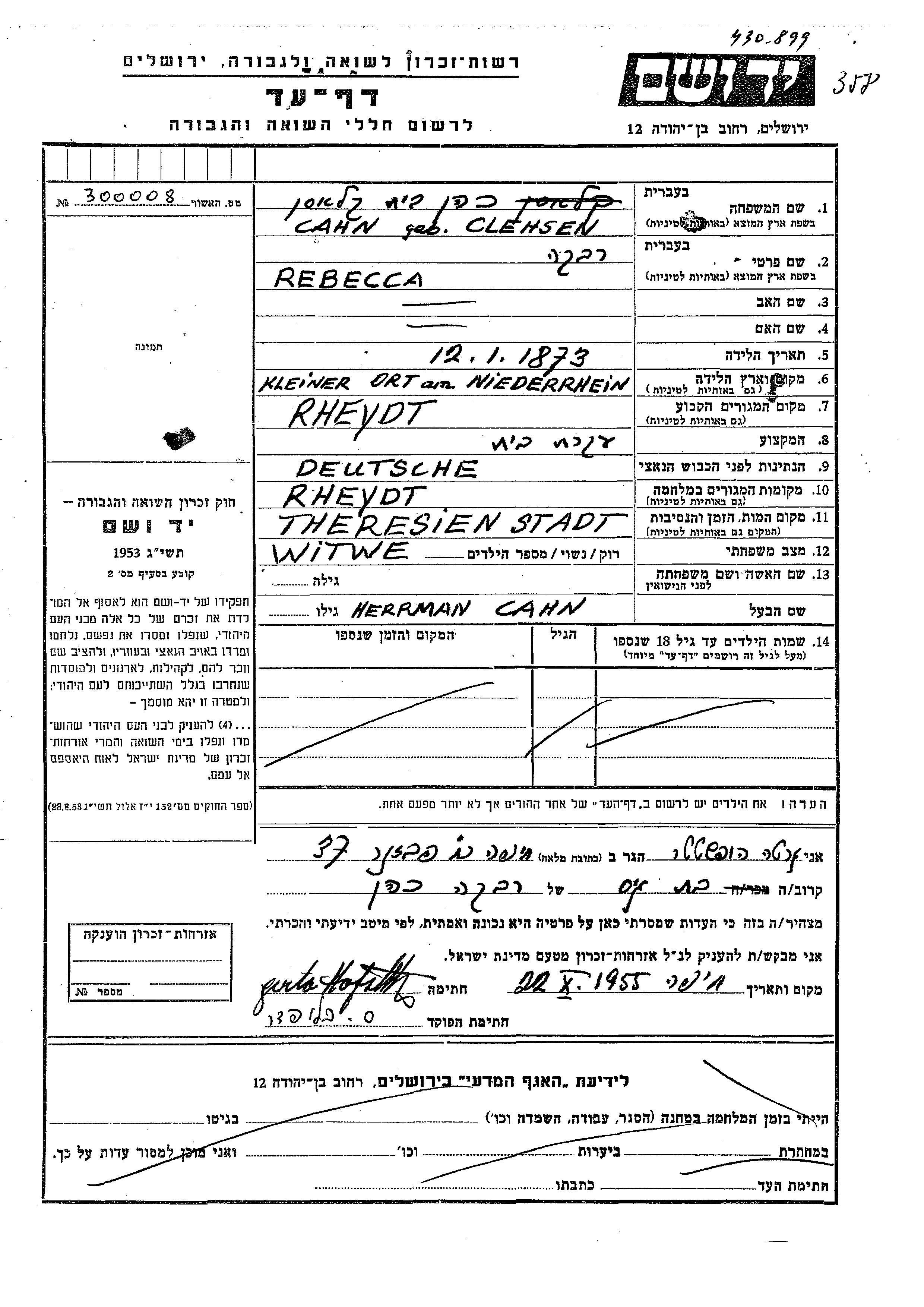 Кан Коэн Ребекка 1873 Рейдт, Германия Лист свидетельских показаний