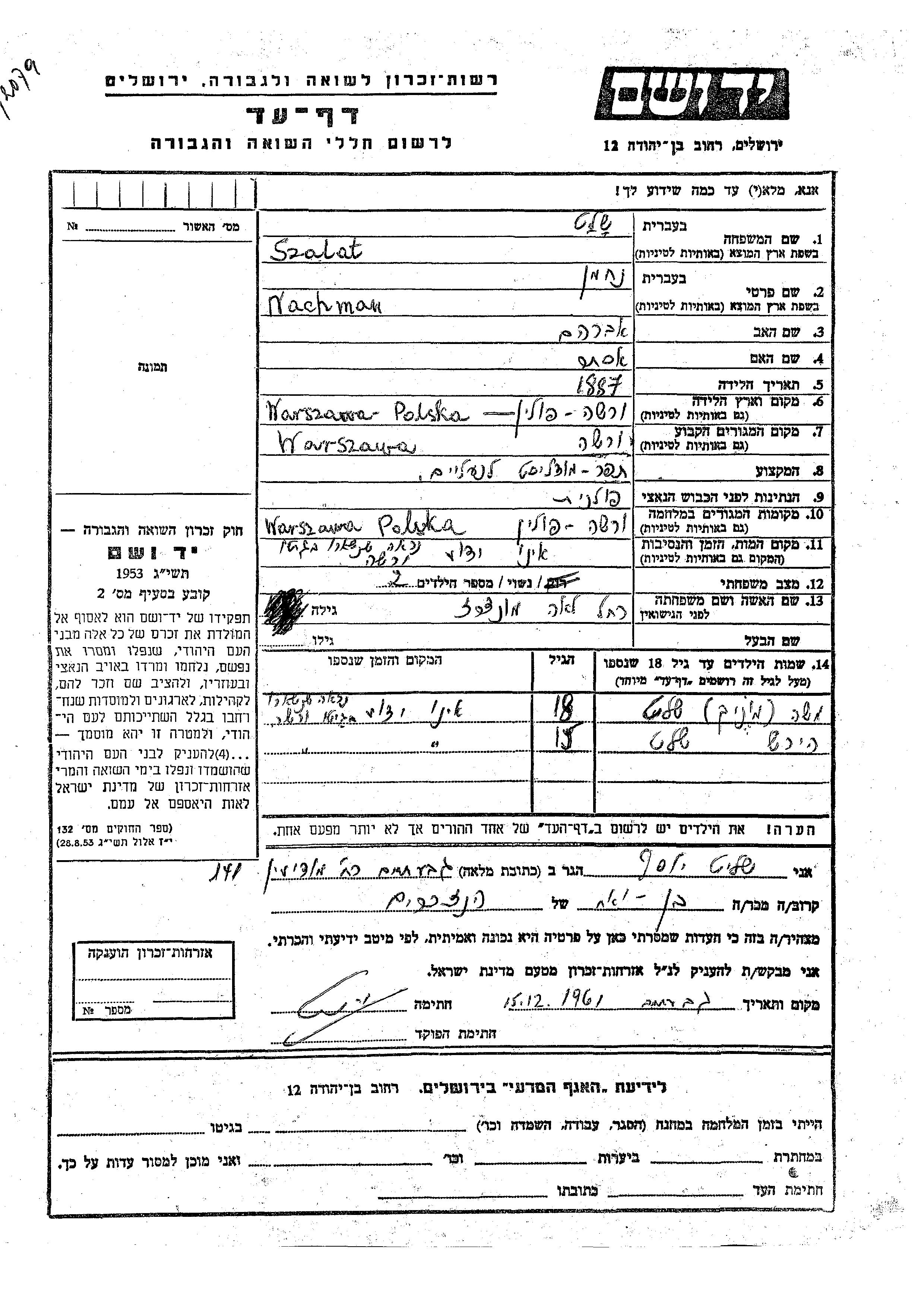 Нахман Шалат, место рождения: Варшава, Польша. Отец: Авраам, mать:Эстер. Портной / закройщик. Женат / замужем. Место жительства до войны: Варшава, Польша. Место во время войны: Варшава, Польша.