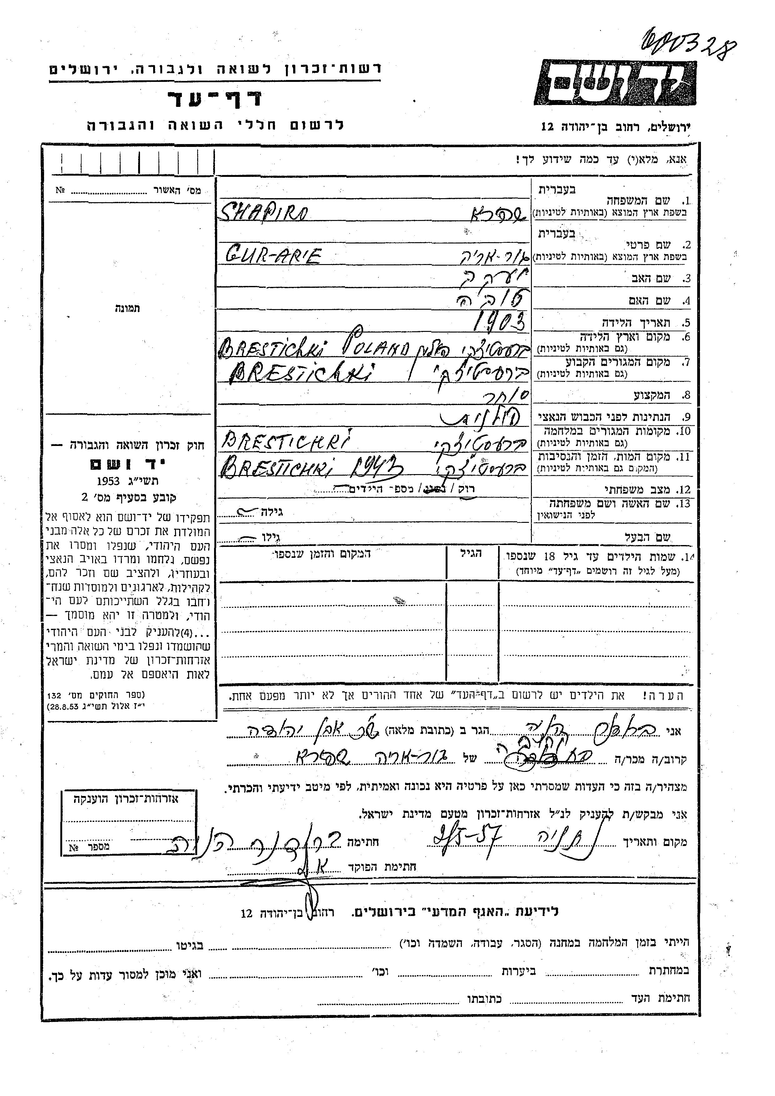 Гур Арье Шапиро, место рождения: Берестечко, Польша. Отец: Яков, mать:Това. Торговец / торговка. Холост / не замужем. Место жительства до войны: Берестечко, Польша. Место во время войны: Берестечко, Польша.