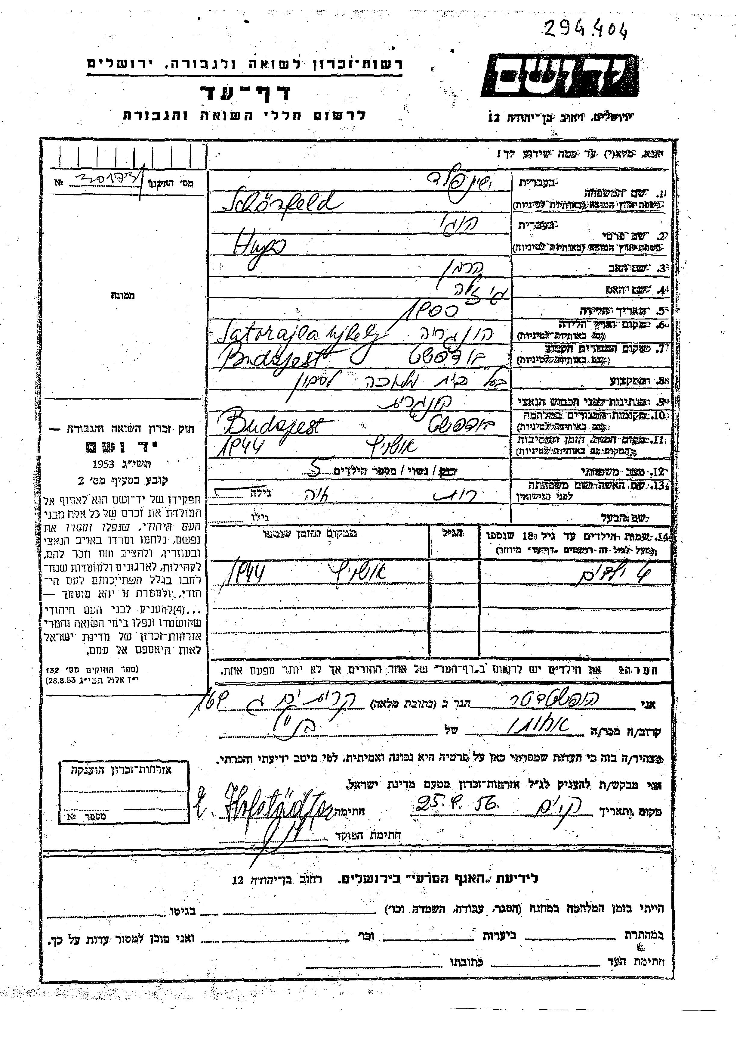 Хуго Шонфельд Шейнфельд, место рождения: Венгрия. Отец: Херман, mать:Гизела. בעל בית מלאכה לסבון. Женат / замужем. Место жительства до войны: Будапешт, Венгрия. Место во время войны: Будапешт, Венгрия.