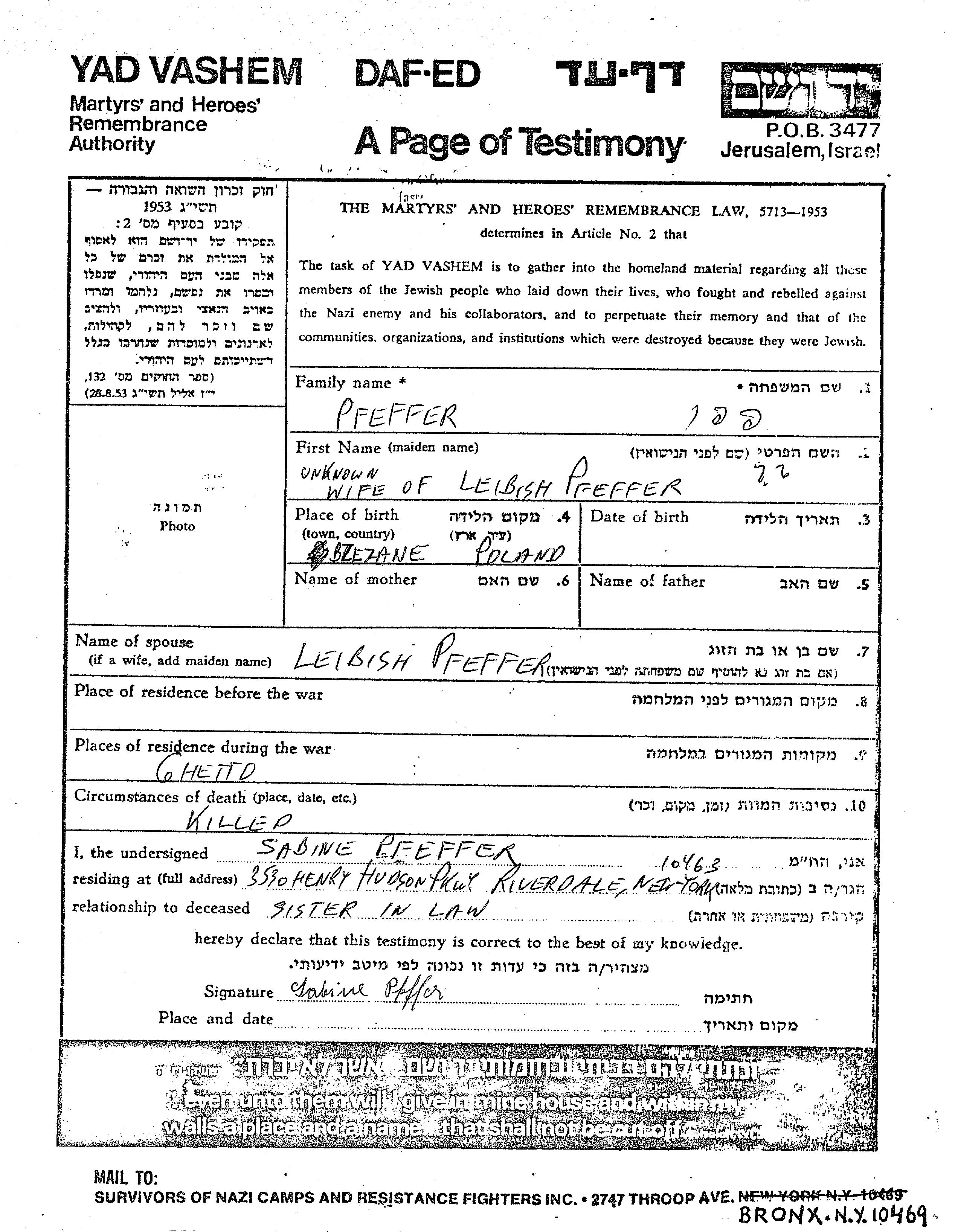Имя неизвестно Феффер, место рождения: Бржежаны, Польша. Женат / замужем. Место во время войны: Бржежаны, Польша.