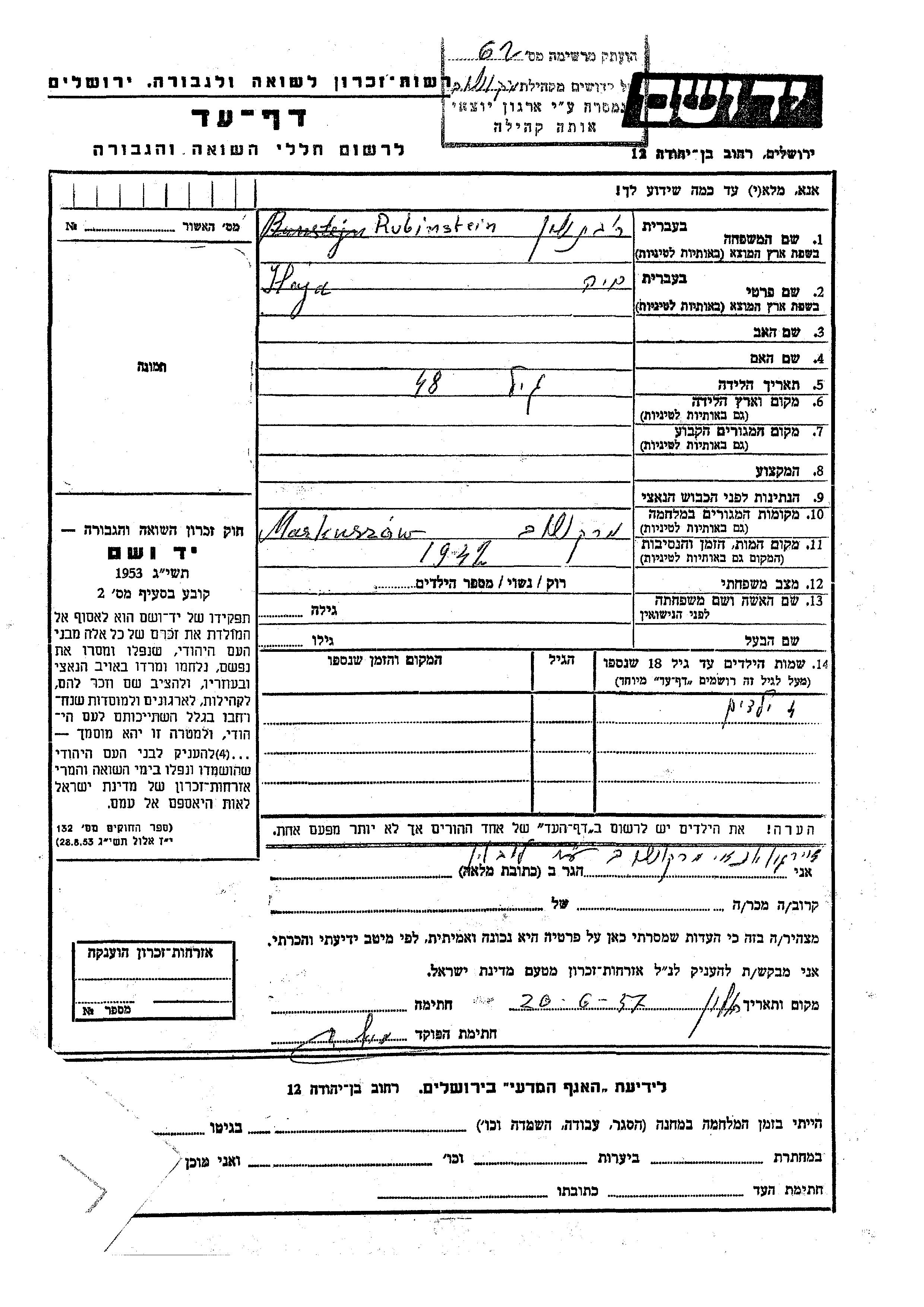 Хая Рубинштайн. Женат / замужем. Место во время войны: Маркушув, Польша.
