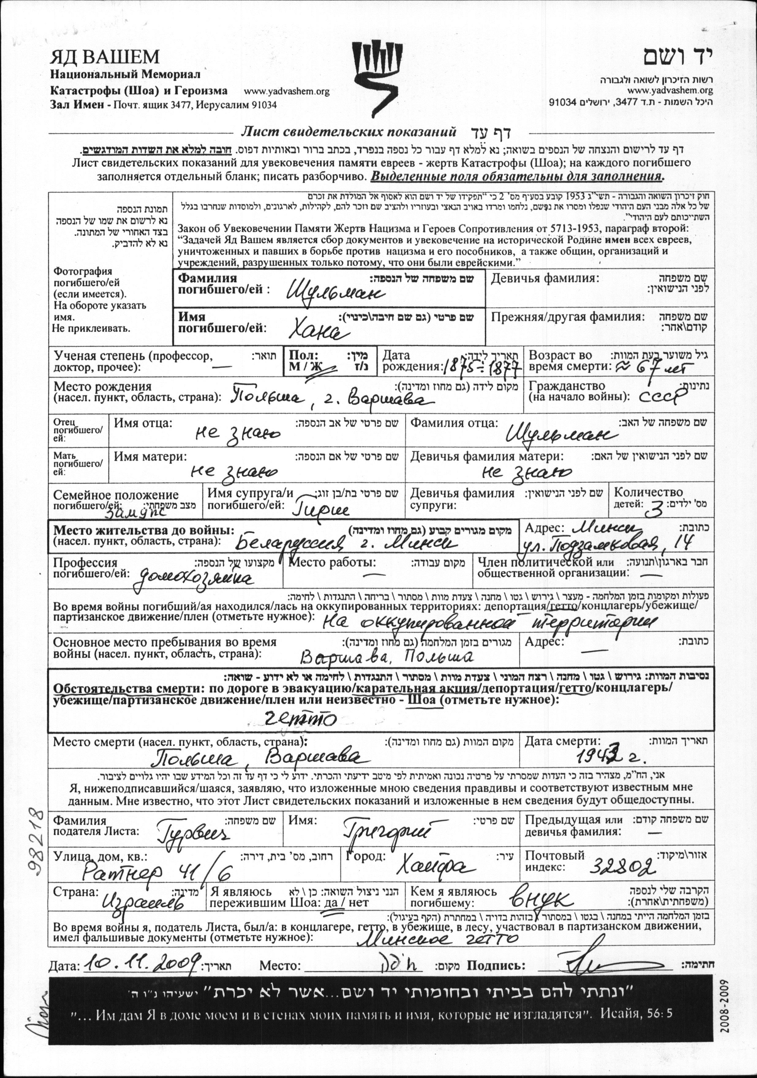 Яд Вашем - Листы свидетельских показаний Мемориального фонда