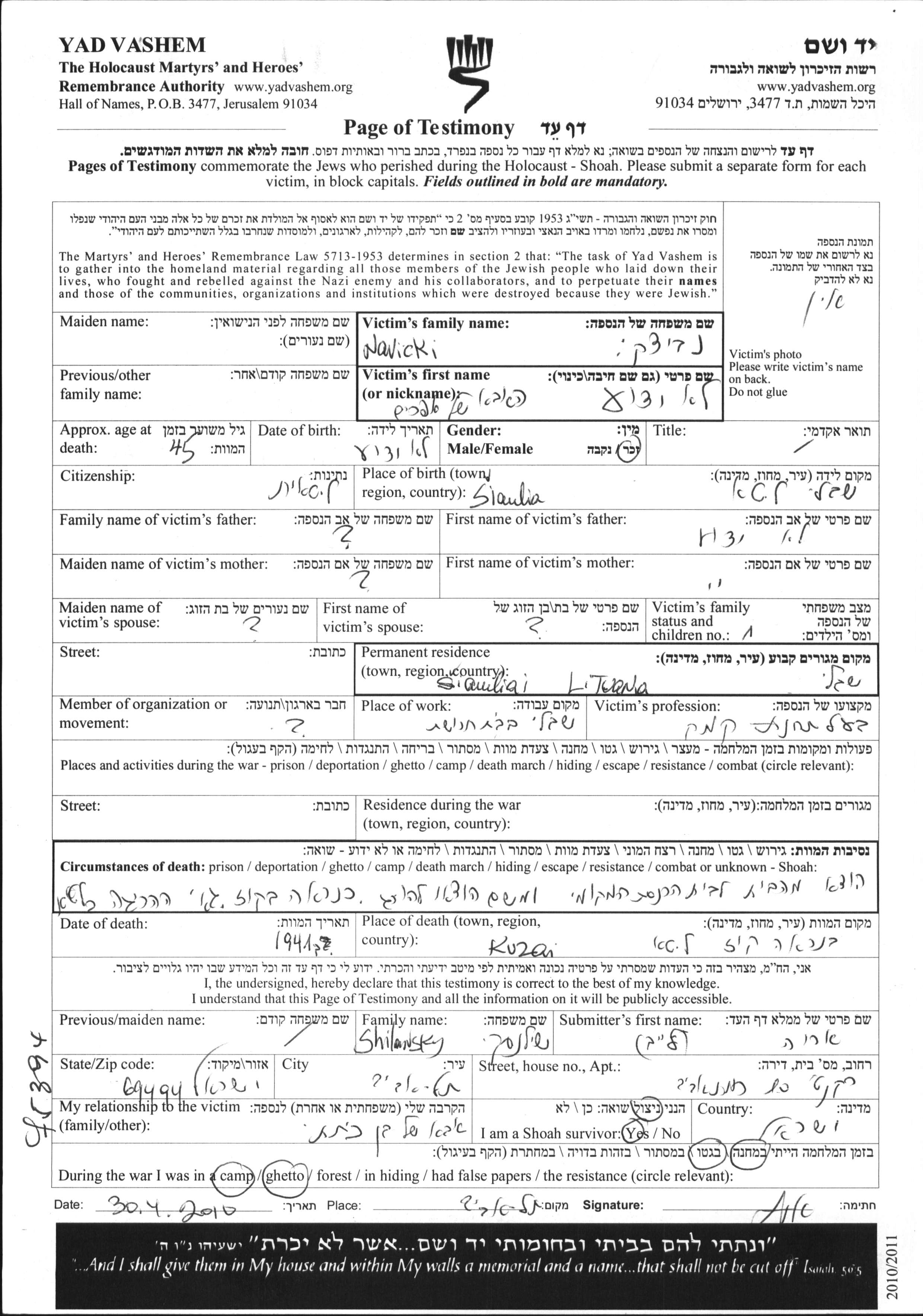 Навицки Имя неизвестно Шауляй, Литва Лист свидетельских показаний