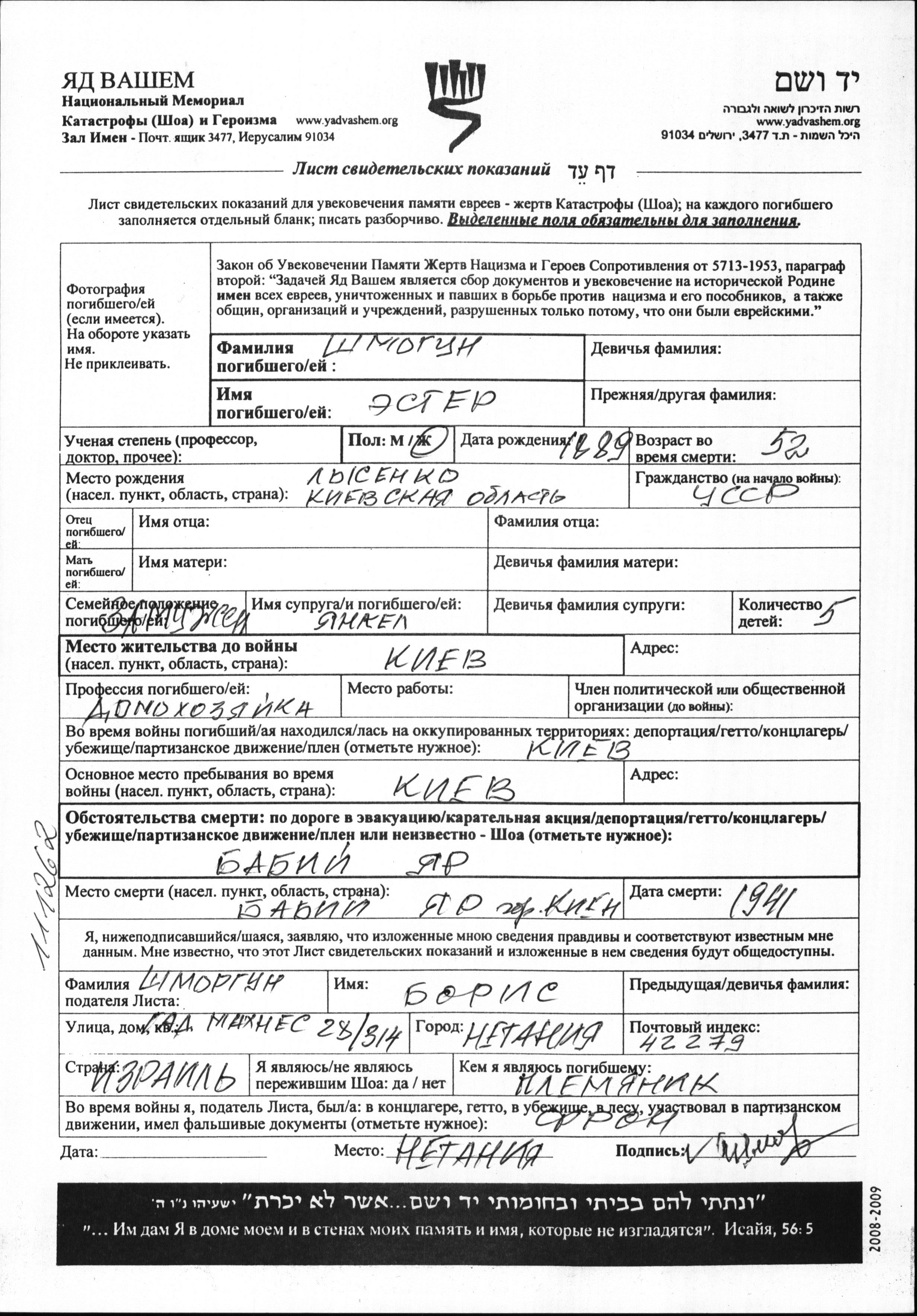Шморгун Эстер 1889 Киев, Украина (СССР) Лист свидетельских показаний