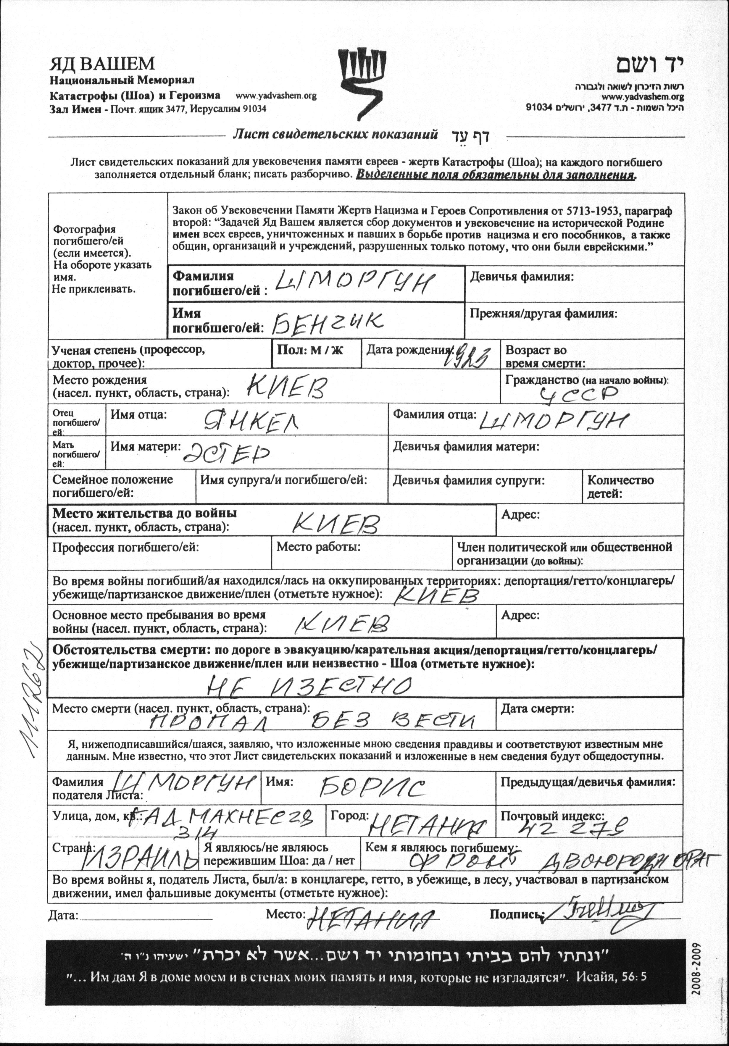 Шморгун Бенчик 1923 Киев, Украина (СССР) Лист свидетельских показаний
