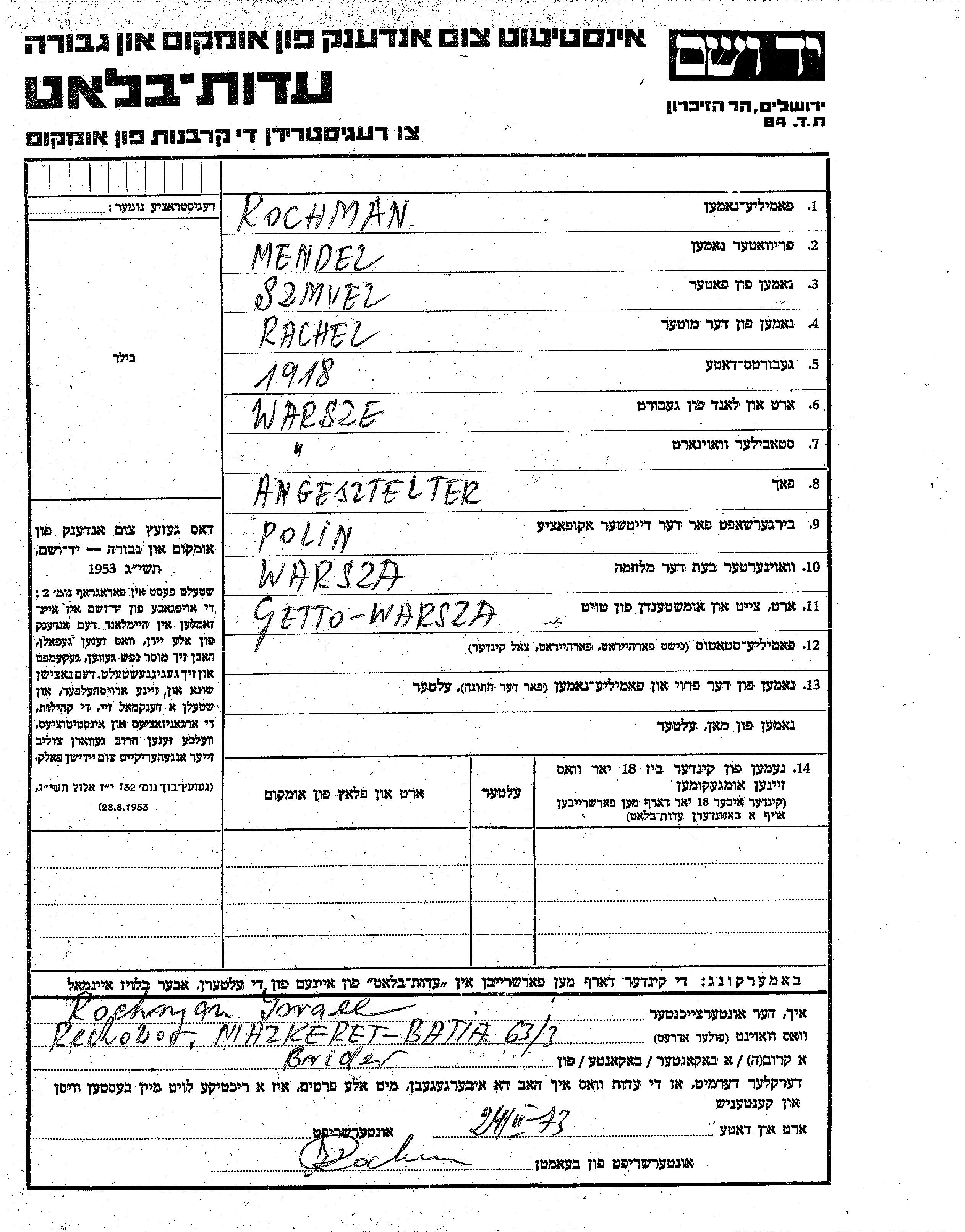 Мендель Рохман, место рождения: Варшава, Польша. Отец: Шмуэль, mать:Рахель. Клерк. Место жительства до войны: Варшава, Польша. Место во время войны: Варшава, Польша. Мендель уничтожен в период Шоа. место смерти: Варшава, Польша.