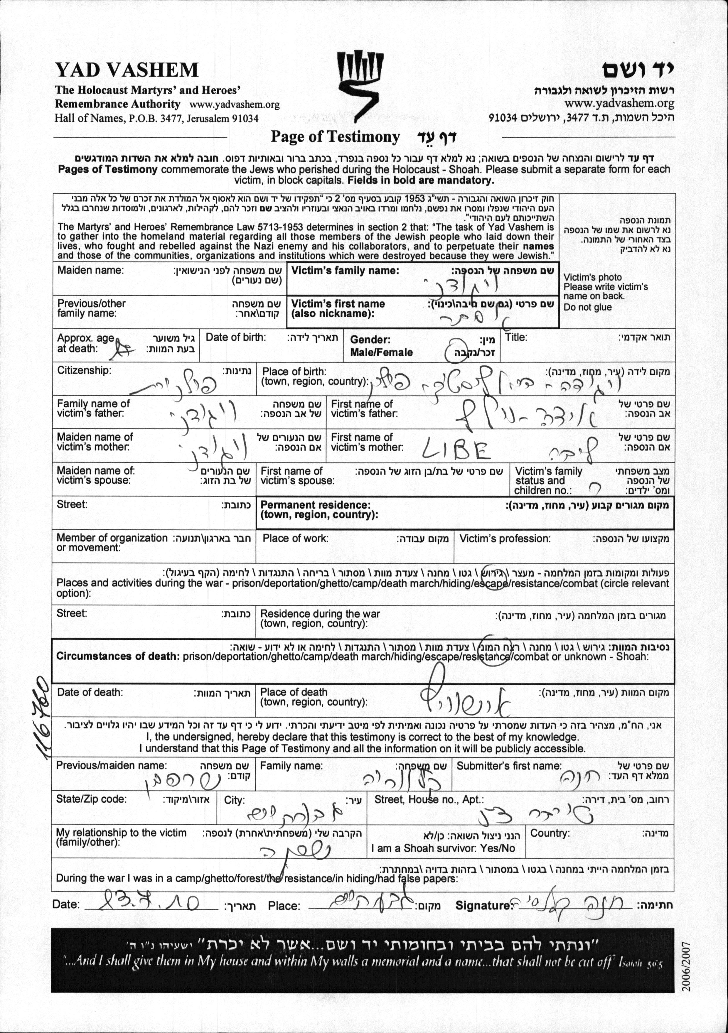 Яд Вашем - Листы свидетельских показаний Мемориального фонда