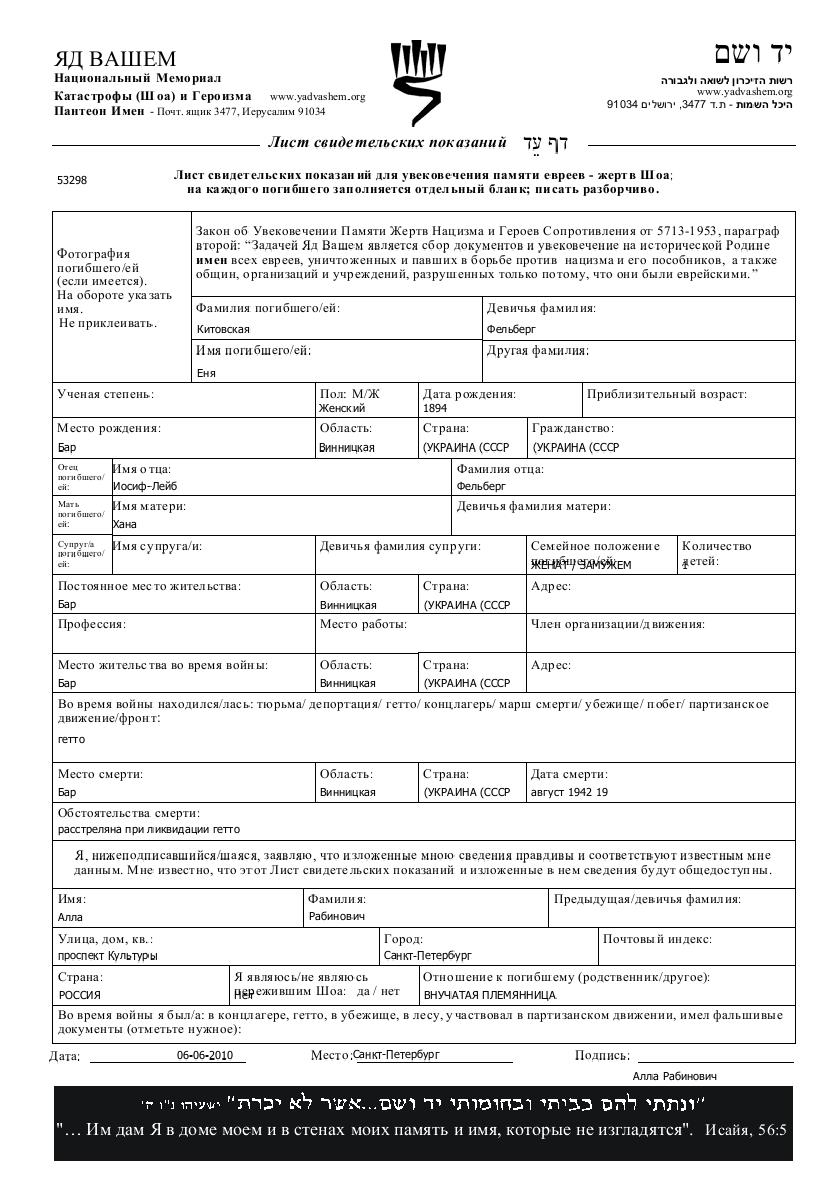 Китовская Еня 1894 Бар, Украина (СССР) Лист свидетельских показаний (электронный)