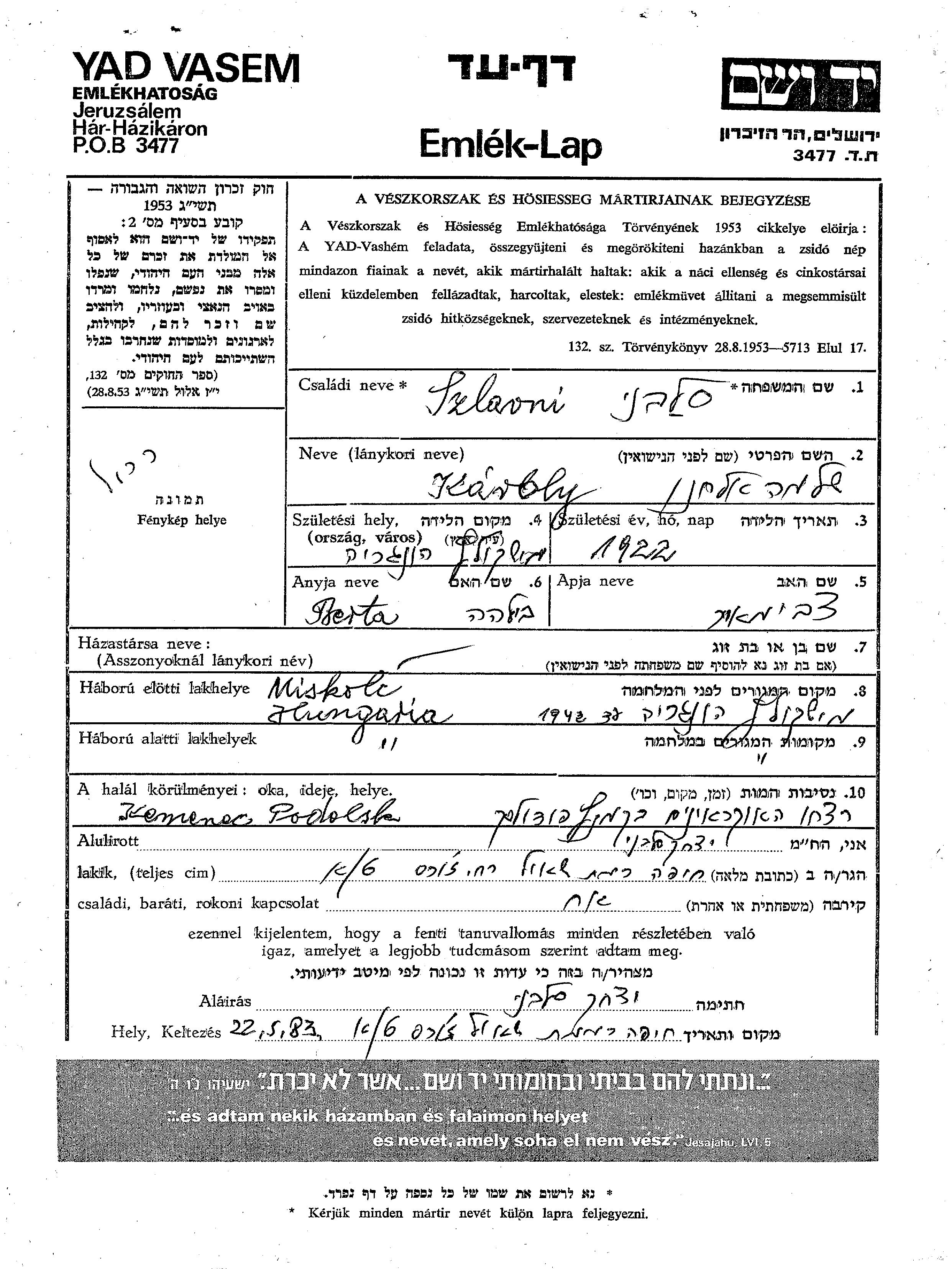Шлавни Карой Шломо Эльханан 1922 Мишкольц, Венгрия Лист свидетельских показаний