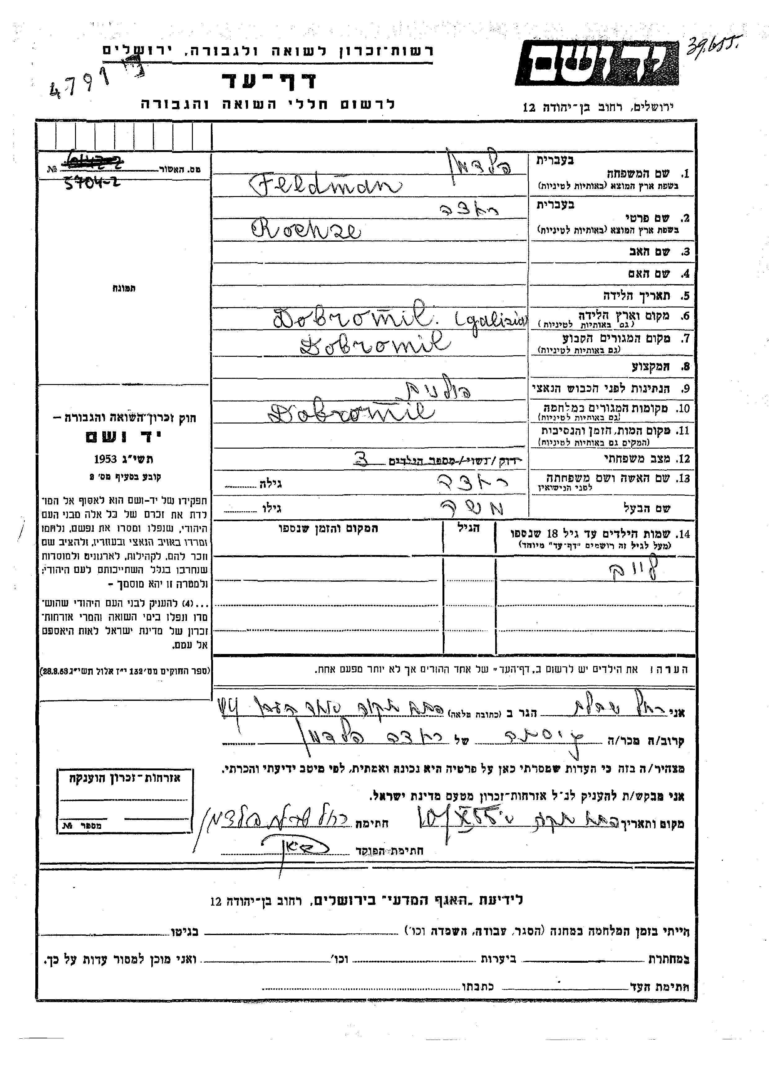 Рахель Фельдман, место рождения: Добромиль, Польша. Холост / не замужем. Место жительства до войны: Добромиль, Польша. Место во время войны: Добромиль, Польша.