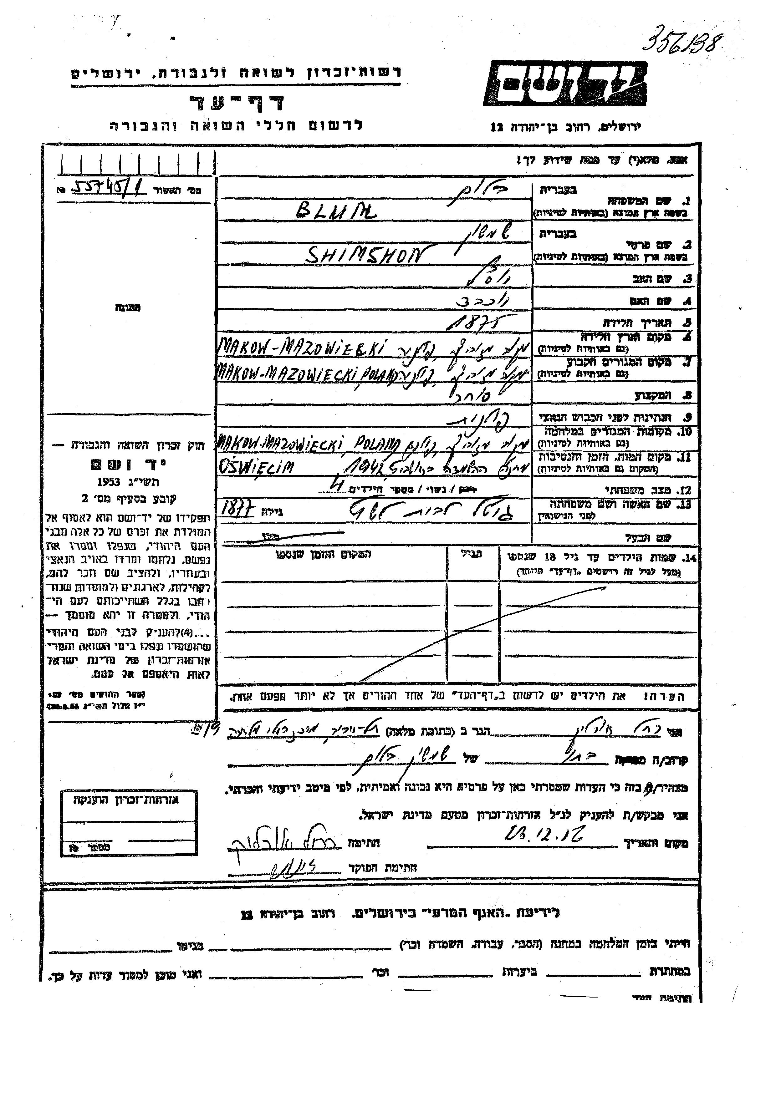 Шимшон Блум, место рождения: Маков-Мазовецки, Польша. Отец: Иосеф, mать:Йохевед. Торговец / торговка. Женат / замужем. Место жительства до войны: Маков-Мазовецки, Польша. Место во время войны: Маков-Мазовецки, Польша.