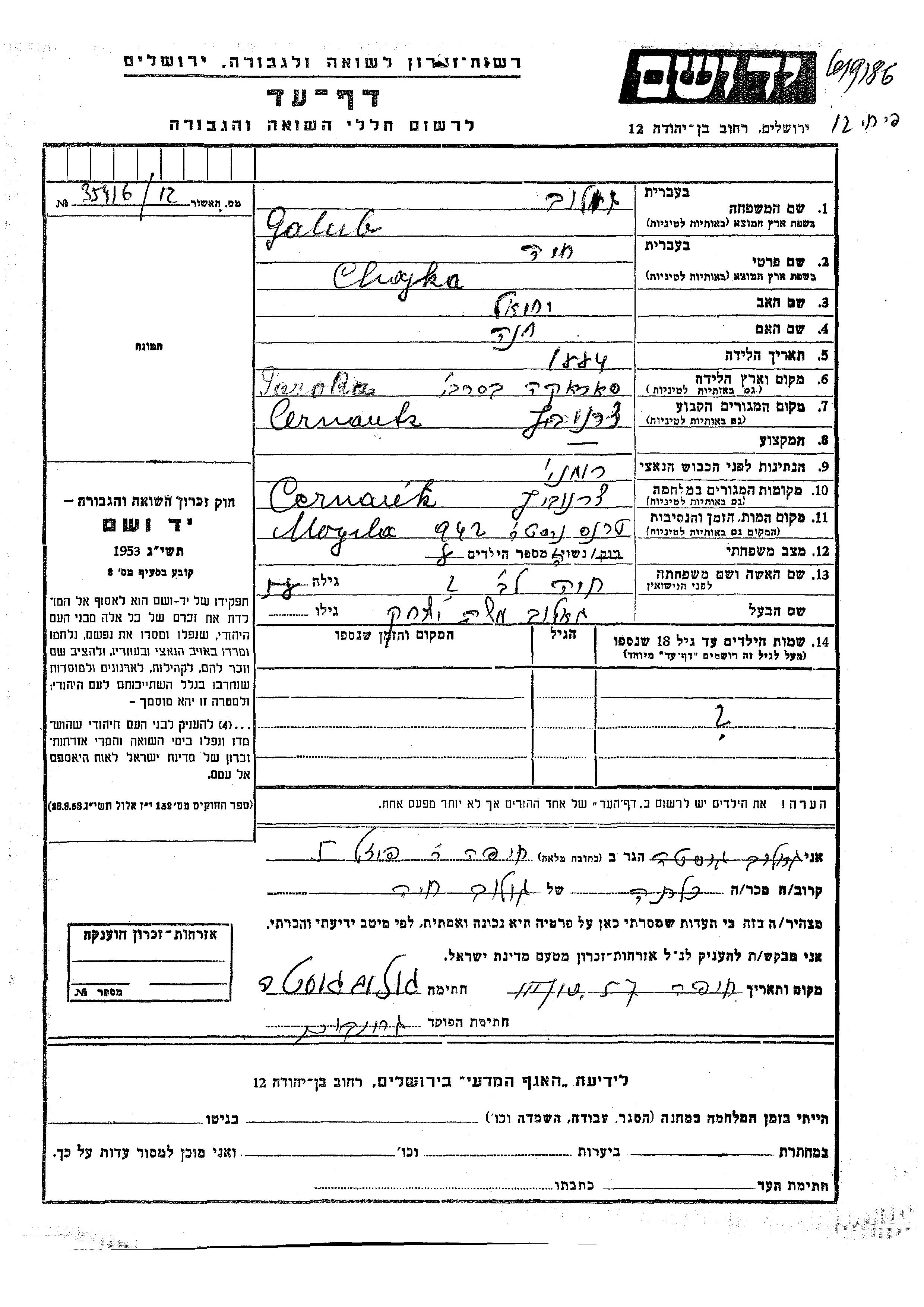 Хайка Голуб, место рождения: Сорока, Румыния. Отец: Иехиэль, mать:Хана. Женат / замужем. Место жительства до войны: Черновцы, Румыния. Место во время войны: Черновцы, Румыния.