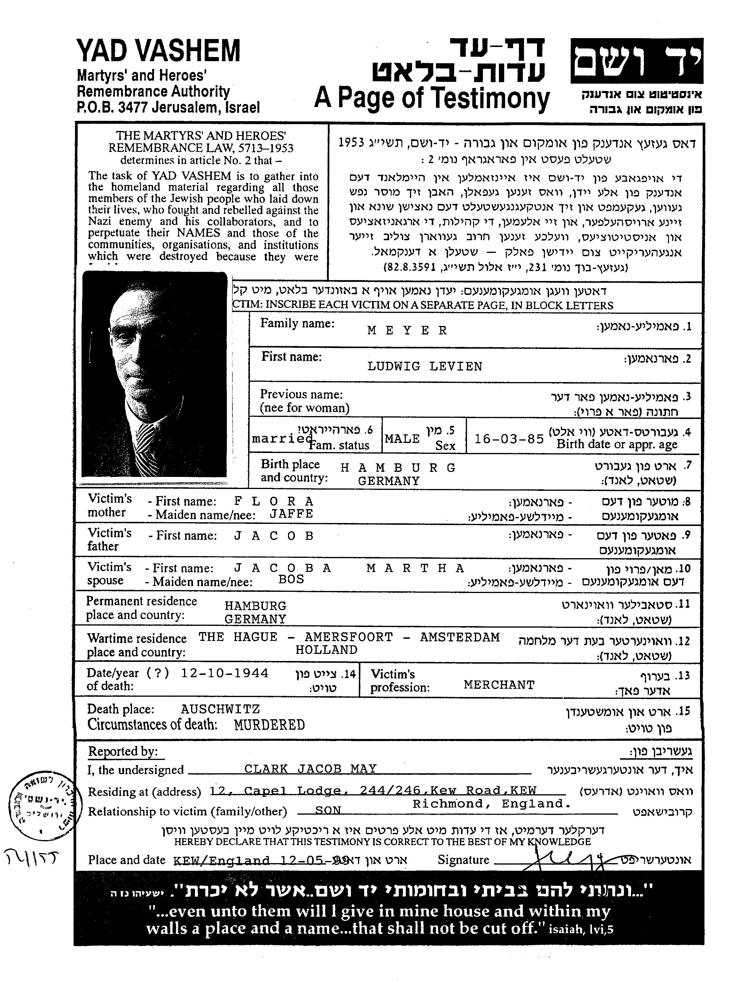 Лудвиг Левин Мейер, место рождения: Гамбург, Германия. Отец: Якоб, mать:Флора. Женат / замужем. Место жительства до войны: Гамбург, Германия. Место во время войны: Терезиенштадт, Чехословакия. Лудвиг Левин уничтожен в период Шоа. место смерти: Аушвиц, Польша в 15/10/1944.