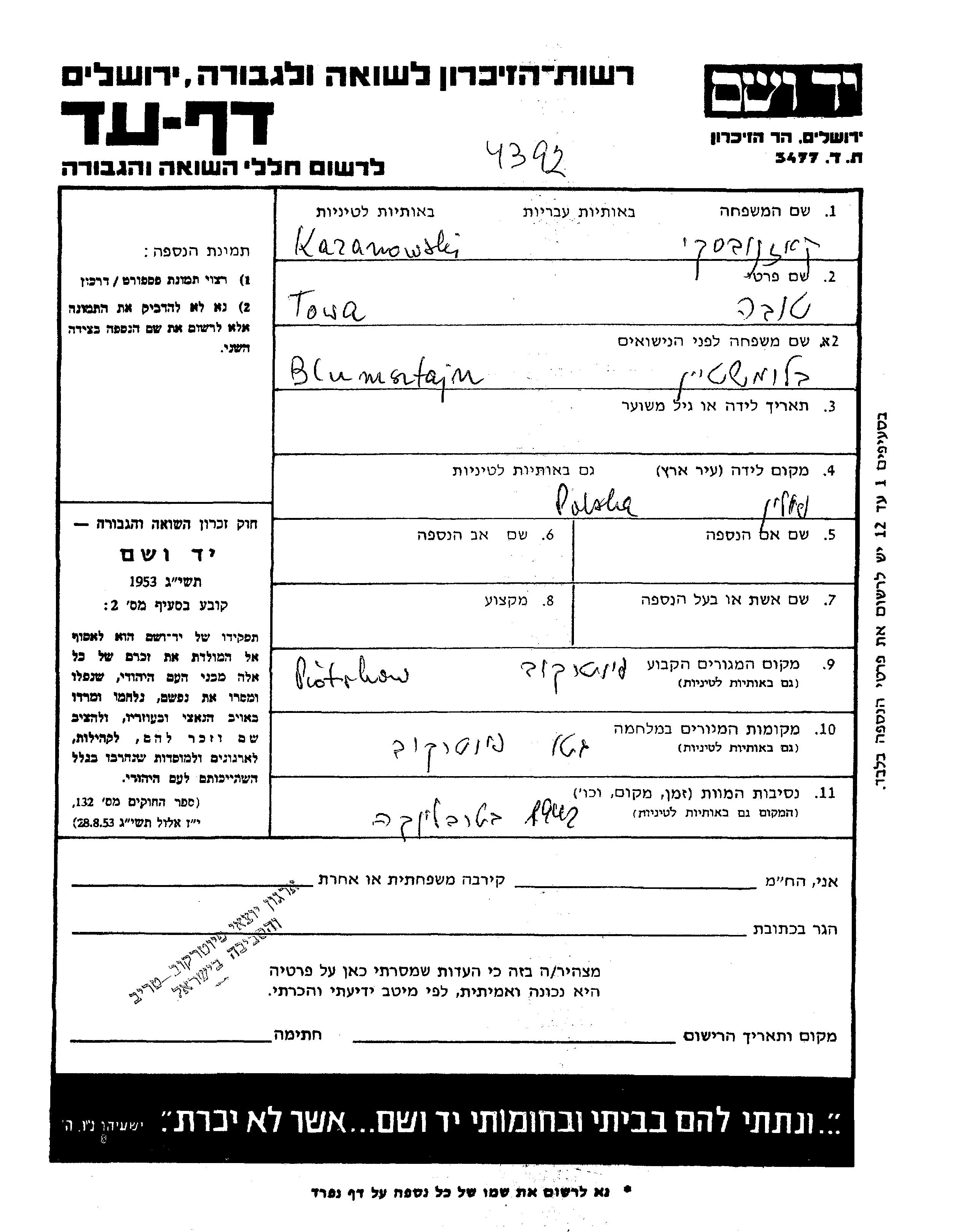 Това Казановски, девичья фамилия Блюмштайн родился/родилась, место рождения: Польша. Место во время войны: Пётркув, Польша.