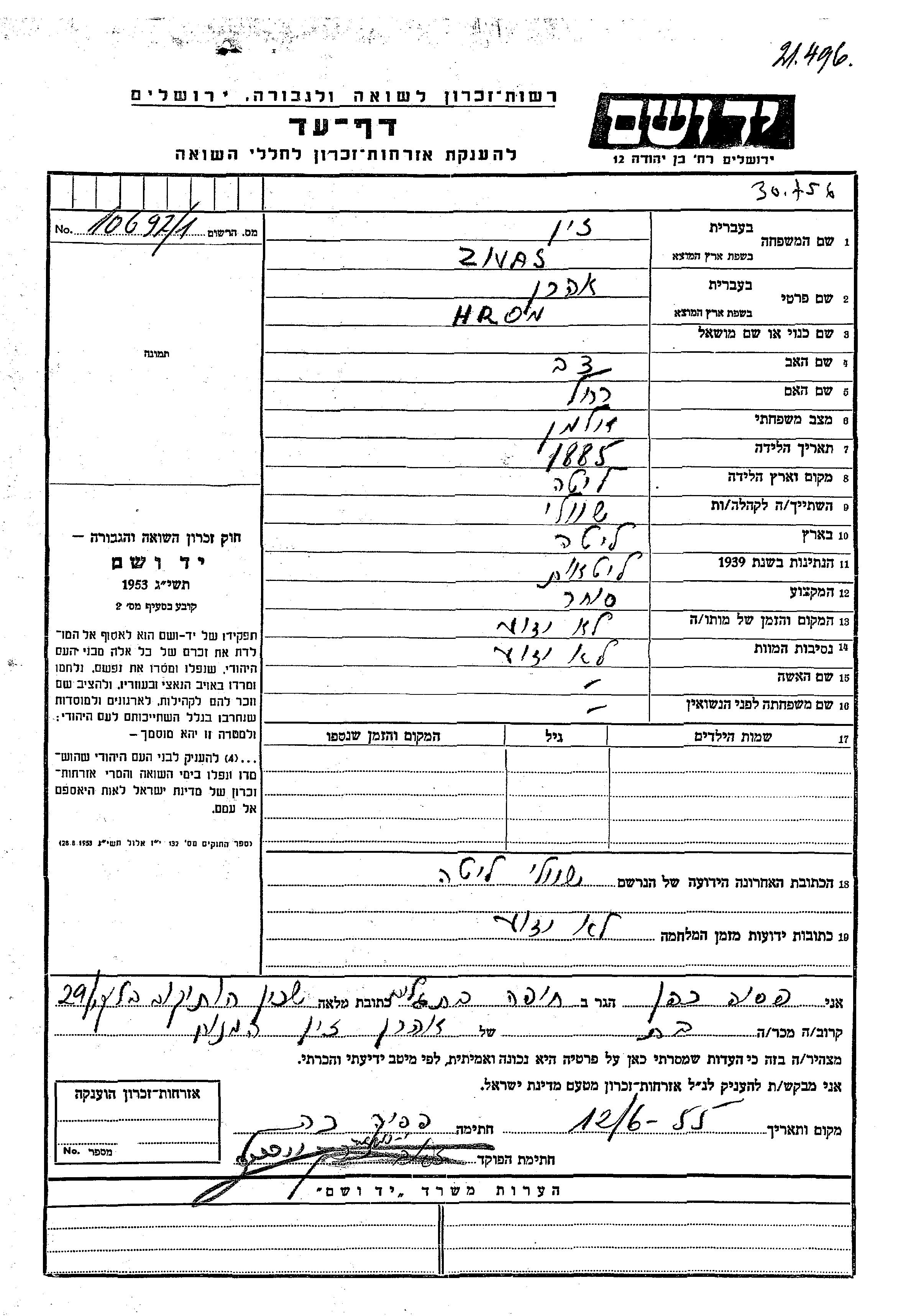 Арон Зивас, место рождения: Литва. Отец: Дов, mать:Рахель. Торговец / торговка. Вдовец. Место жительства до войны: Шауляй, Литва. Место во время войны: Шауляй, Литва.