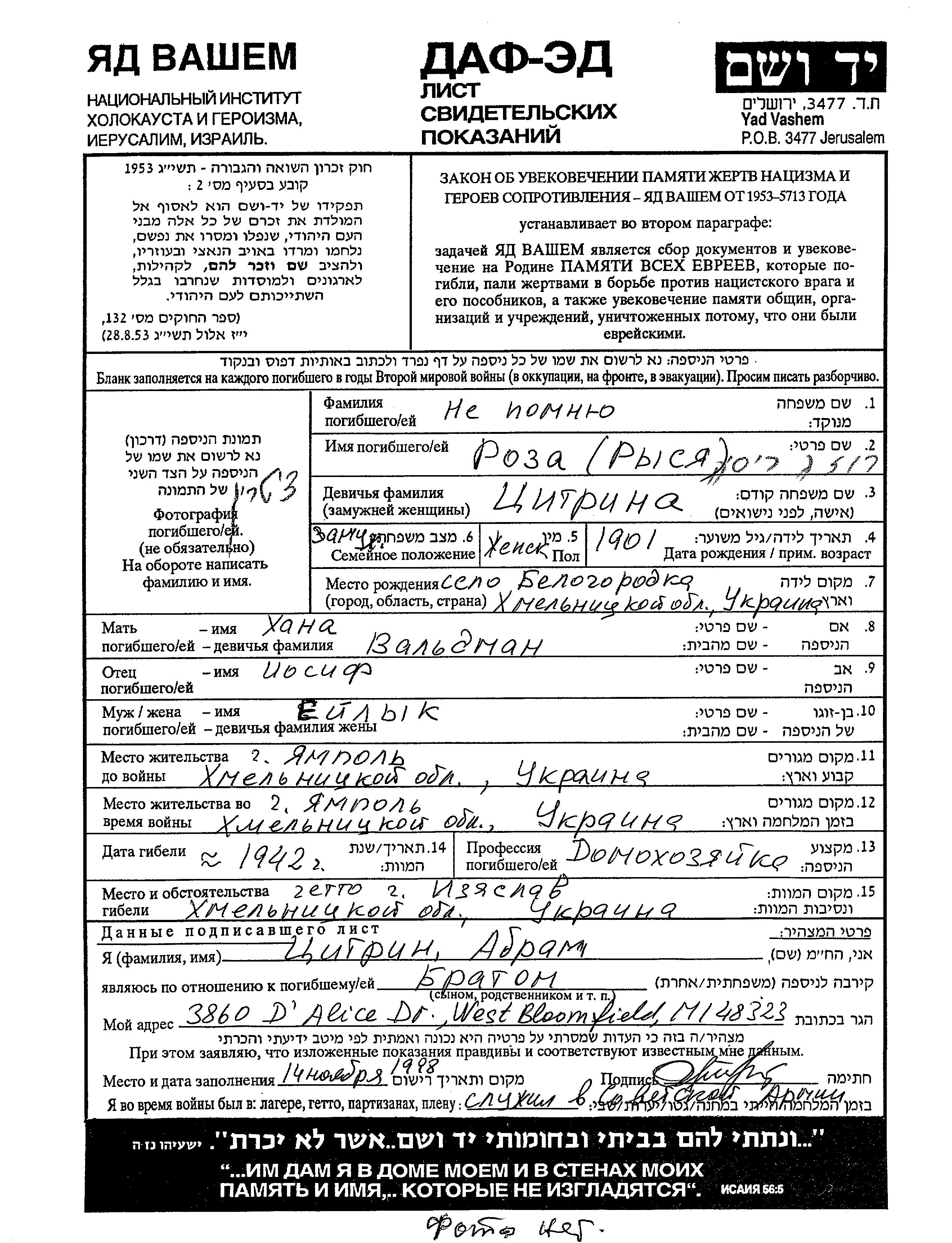 Фамилия неизвестна Рыся Роза Рися 1901 Ямполь, Украина (СССР) Лист свидетельских показаний