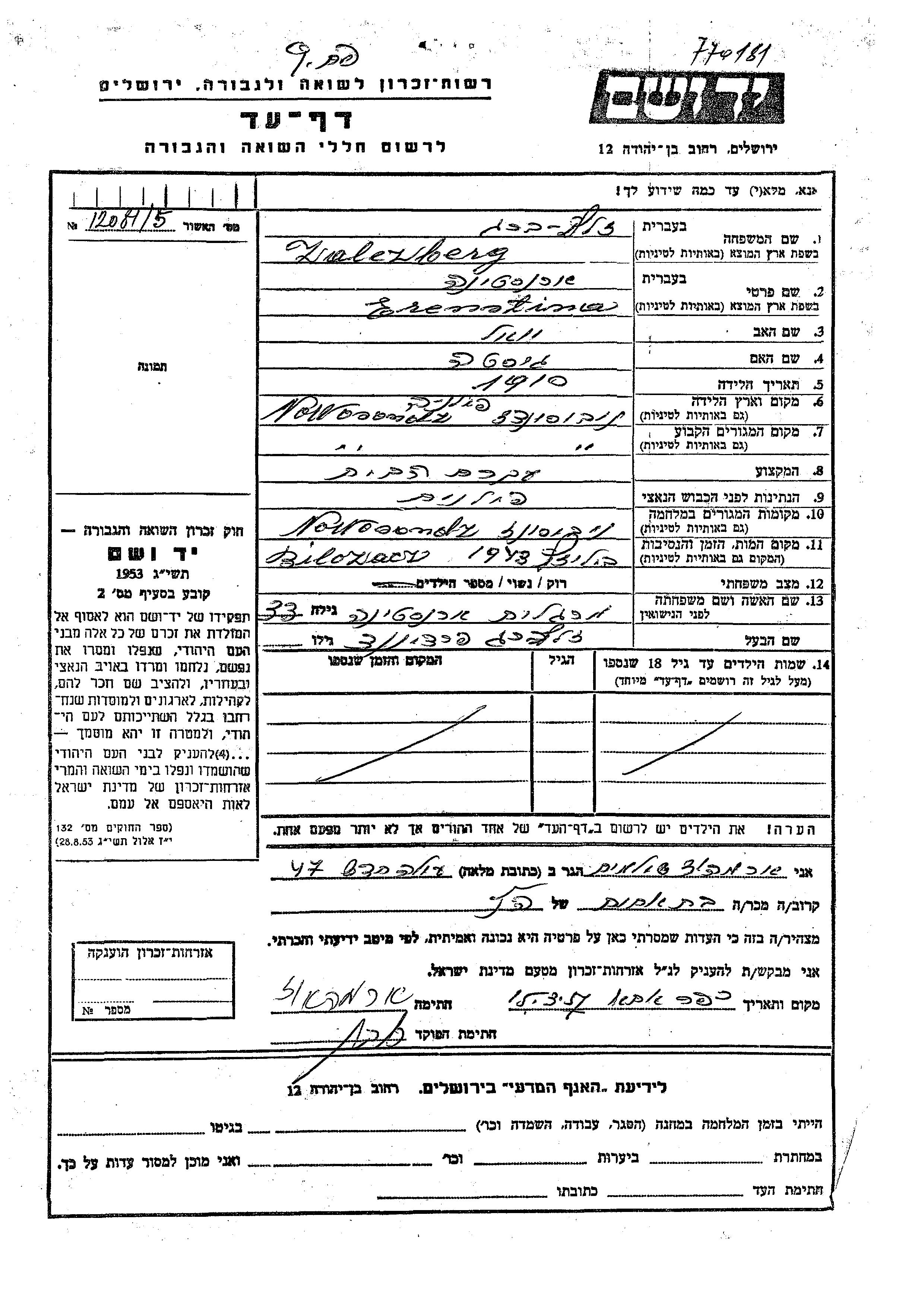 Яд Вашем - Листы свидетельских показаний Мемориального фонда
