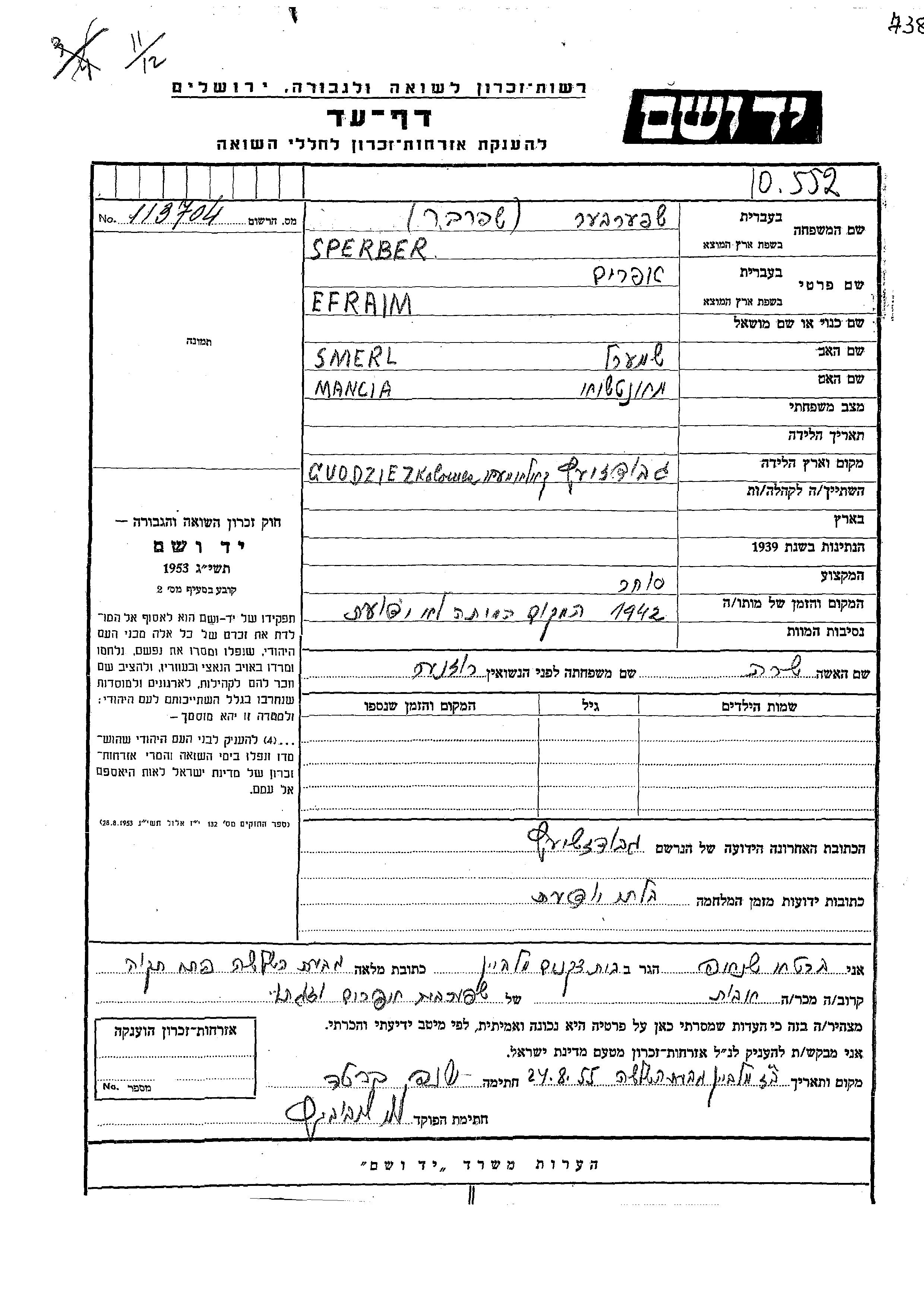 Эфраим Шпербер, место рождения: Гвоздец Място, Польша. Отец: Шмерл, mать:Манча Манчя. Торговец / торговка. Женат / замужем. Место жительства до войны: Гвоздец Място, Польша.