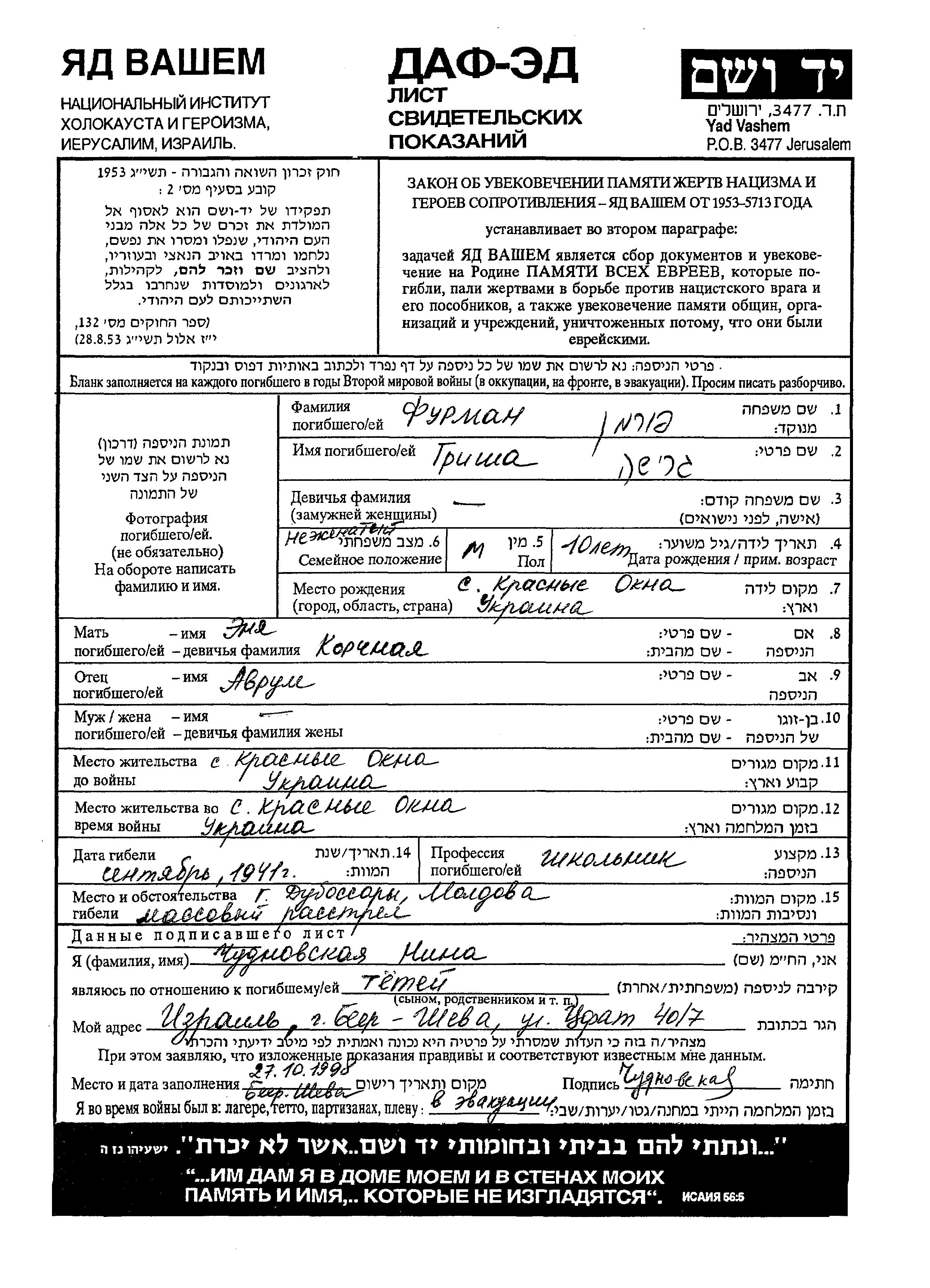 Фурман Гриша 1931 Красные Окна, Украина (СССР) Лист свидетельских показаний