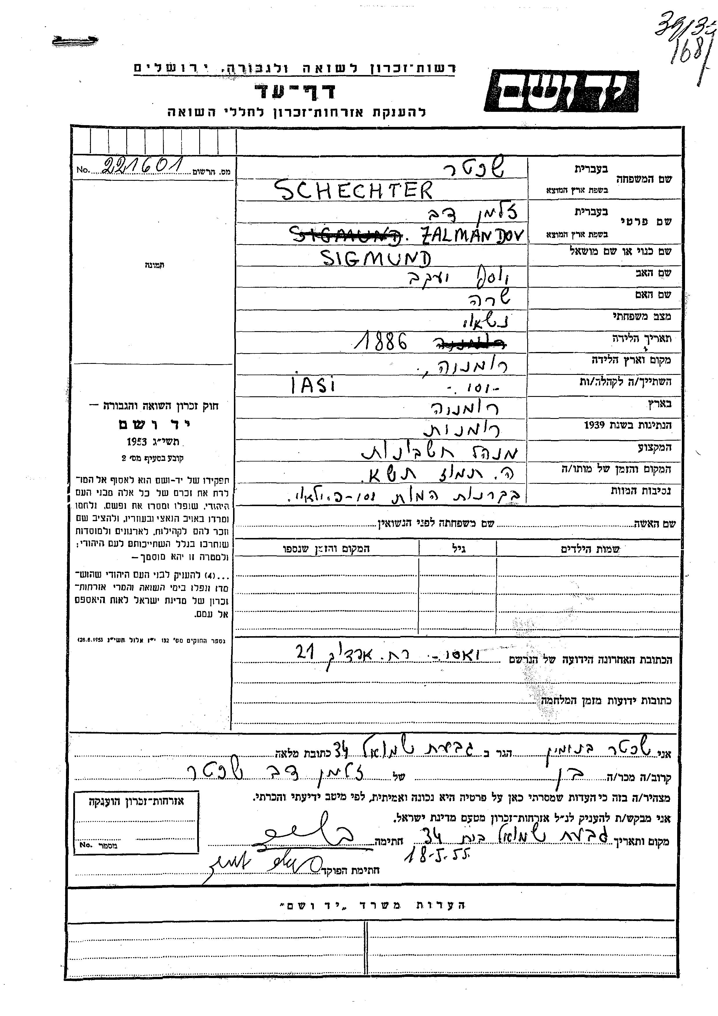 Залман Сигмунд Дов Шехтер, место рождения: Румыния. Отец: Иосеф Яков, mать:Сара. Бухгалтер / счетовод. Место жительства до войны: Яссы, Румыния. Место во время войны: Яссы, Румыния.